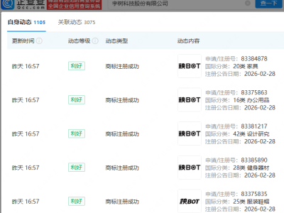 - 宇树科技成功注册多枚“秧 BOT”商标