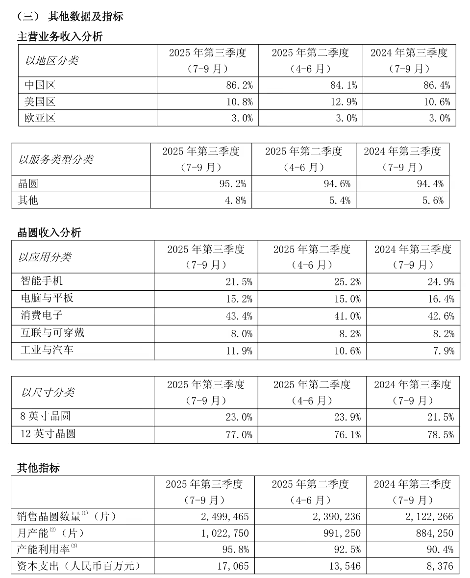 从区域收入结构来看,2025年第三季度主营业务收入中,中国区贡献占比最高,达到86.2%,美国区与欧亚区分别占10.8%和3%。公司管理层指出,利润增长主要得益于晶圆出货量同比提升以及产品组合优化带来的积极影响。