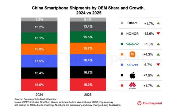 Counterpoint数据显示,2025年中国市场前五大手机厂商分别为华为(16.9%)、苹果(16.7%)、vivo(16.4%)、小米(15.7%)和OPPO(15.5%)。荣耀以13.4%的市占率位列第六,出货量同比下滑12.6%。尽管国内市场表现低迷,但荣耀在海外市场的增速却领跑行业,全年海外出货量同比增长47%,业务占比首次突破50%。