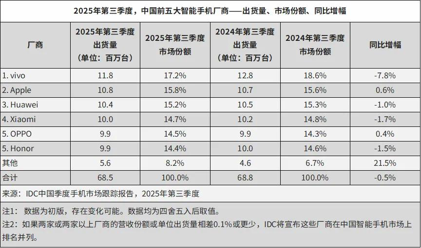 IDC最新报告显示,2025年中国智能手机市场出货量预计为2.84亿台,同比下降0.6%。在存量竞争加剧的背景下,手机厂商正面临前所未有的挑战。头部品牌通过争夺资本市场叙事权寻求突破,而未能跻身前五的厂商则面临被边缘化的风险。