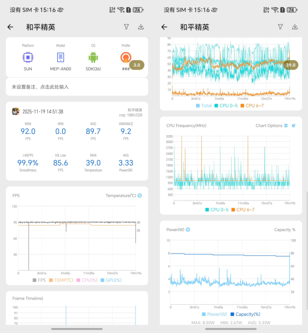 性能与续航表现同样亮眼。全系搭载骁龙8系旗舰芯,Pro版配备骁龙8 Elite芯片,配合OS Turbo X应用启动优化与Vulcan图形引擎,多任务流畅无卡顿,抖音百张图片滑动加载更快,游戏体验尤为突出。实测《和平精英》最大帧率为92fps,5%low为85.6fps,温度控制在39℃。更突破性的是,轻薄机身内塞入一块8000mAh青海湖电池,续航能力提升40%以上,彻底告别一天多充焦虑。同时配备80W超级有线快充、50W无线快充及27W反向充电功能,搭配都江堰AI电源管理与定制快充芯片,实现电量精准测量。