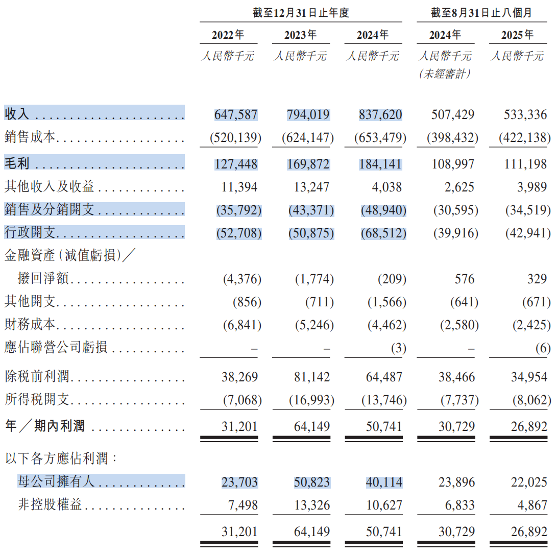 财务数据显示,优乐赛近三年营收保持增长态势。2022年至2024年,公司分别实现营业收入6.48亿元、7.94亿元和8.38亿元,复合增长率达14.1%;同期归母净利润分别为0.24亿元、0.51亿元和0.40亿元。2025年前8个月,公司营收进一步增至5.33亿元,净利润为0.22亿元。毛利率方面,公司从2022年的19.7%提升至2024年的22.0%,盈利能力稳步增强。