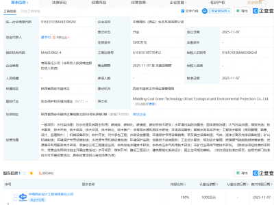 - 中国中煤在西安新设生态环保公司,注册资本5000万