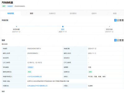 - 小米汽车申请的挖孔机盖外观专利获授权