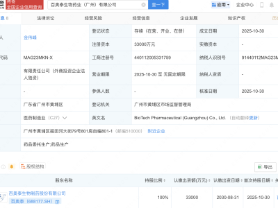 - 百奥泰成立生物药业公司,注册资本3.3亿