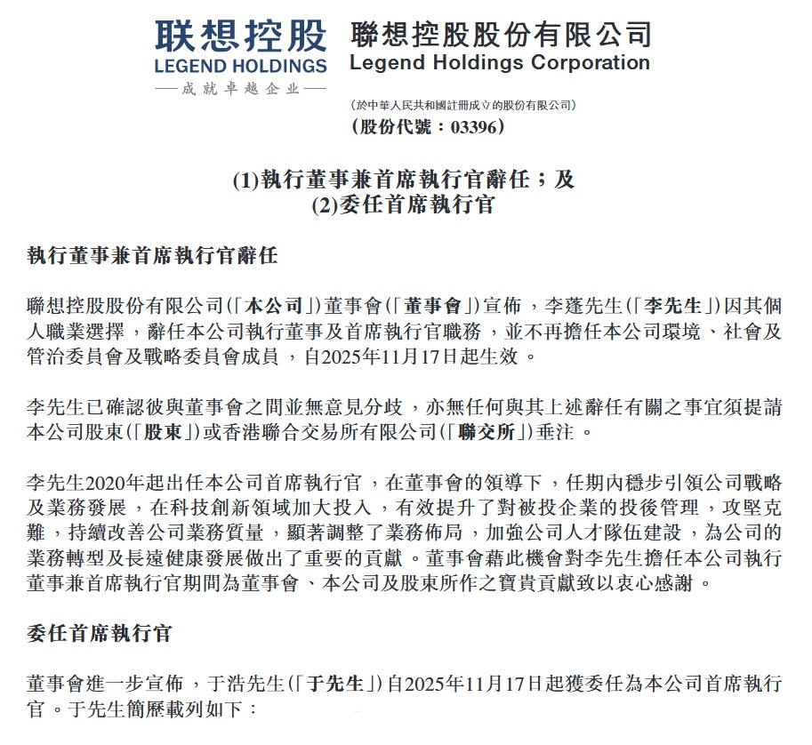 在李蓬辞任的同时,联想控股也宣布了新任首席执行官的委任决定。经董事会慎重考虑,决定委任于浩为公司新任首席执行官,同样自2025年11月17日起接任。于浩在加入联想控股前,已在物联网、大数据、AI等领域积累了丰富的技术研发与产业落地经验,其专业背景和能力得到了董事会的认可。