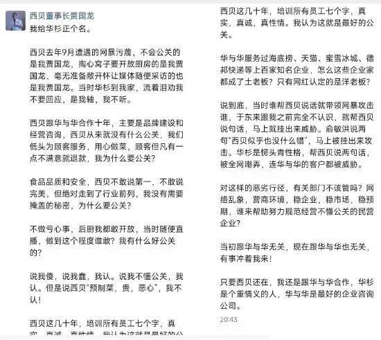 与此同时,西贝餐饮创始人贾国龙在朋友圈发布的一则动态引发了广泛关注。贾国龙回忆称,去年9月西贝遭遇了严重的网暴污蔑事件,当时只要有人为西贝发声,就会遭到网暴攻击。华与华董事长华杉因出面支持西贝,不仅自身被全网嘲弄,其执掌的华与华公司客户也受到连带威胁。贾国龙对此类恶劣行径表示质疑,并呼吁相关部门能够出手规范,改善网络乱象,优化营商环境。