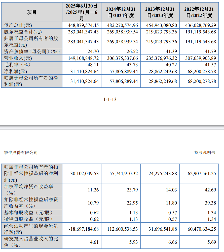 从财务数据来看,报告期内(2022年至2025年上半年),锐牛股份的营业收入呈现出一定的波动。2022年营业收入为3.08亿元,2023年降至2.35亿元,2024年回升至3.06亿元,2025年上半年则为1.49亿元。净利润方面,2022年为6820.03万元,2023年下降至2886.22万元,2024年又回升到5780.69万元,2025年上半年为3141.08万元。