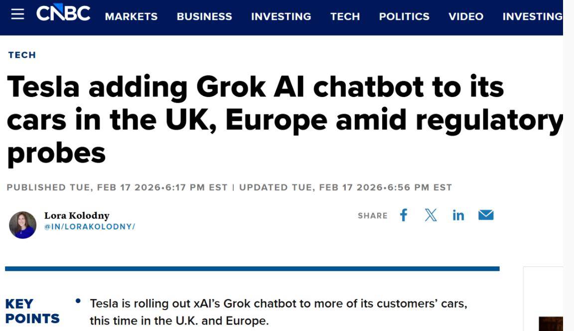 特斯拉在欧洲市场正面临前所未有的销售压力,为扭转颓势,这家电动汽车巨头选择将人工智能技术作为突破口。2月20日,特斯拉欧洲、中东和非洲(EMEA)区域官方宣布,其旗下xAI公司开发的Grok人工智能服务正式登陆英国、爱尔兰、德国、瑞士、奥地利、意大利、法国、葡萄牙和西班牙九个国家。这一举措被视为特斯拉重塑智能汽车生态的关键一步,旨在通过前沿技术吸引注重科技体验的高端用户。