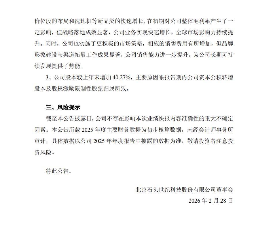 石头科技最新发布的业绩快报显示,2025年公司经营呈现营收增长与利润承压并行的态势。全年实现营业总收入186.16亿元,同比增幅达55.85%,但归属于母公司股东的净利润为13.6亿元,较上年同期下降31.19%,基本每股收益5.28元。这一数据反映出企业在规模扩张过程中面临的阶段性挑战。