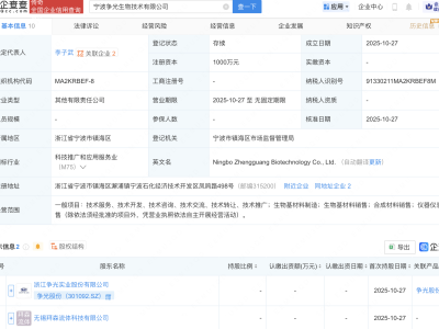 - 争光股份等在宁波成立生物技术公司