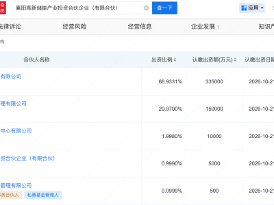 - 襄阳高新储能产业投资合伙企业成立,出资50.05亿