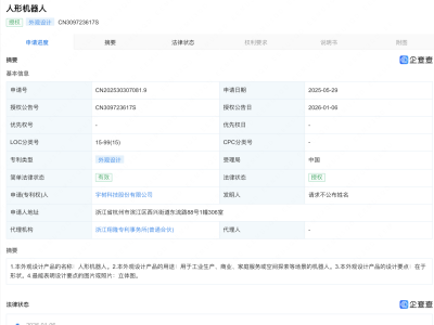 - 宇树科技人形机器人外观专利获授权,可用于空间探索等场景