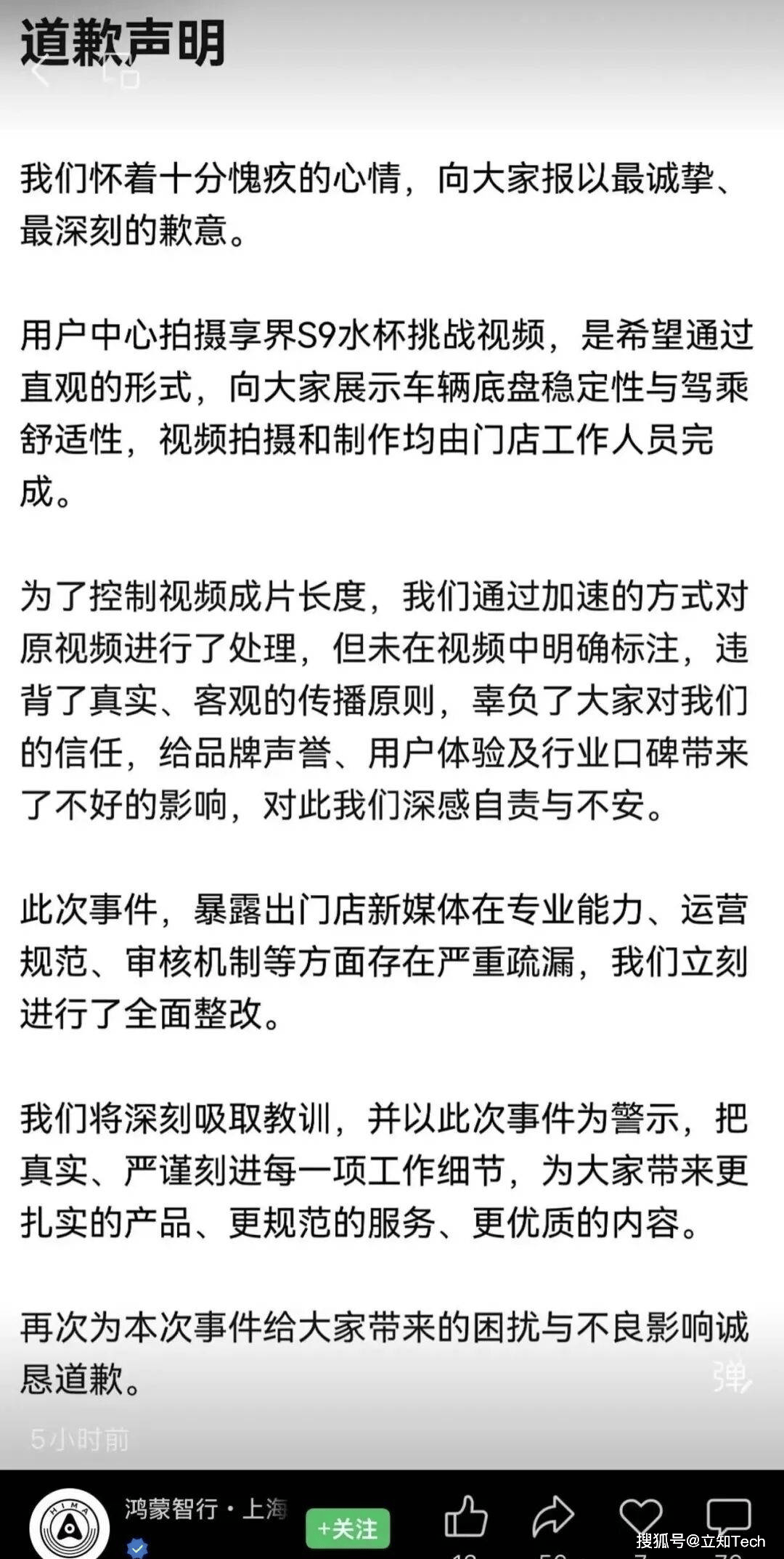 面对舆论压力,涉事的两家上海门店于3月1日同步发布道歉声明。针对尊界S800视频,门店承认采用正常拍摄与倒放画面融合的剪辑手法,但未履行标注义务;享界S9视频制作方则解释称,加速处理系出于控制视频时长的考虑,并承认暴露出新媒体运营能力不足和审核流程漏洞。目前,相关争议视频已全部下架,涉事门店表示将开展全面整改。