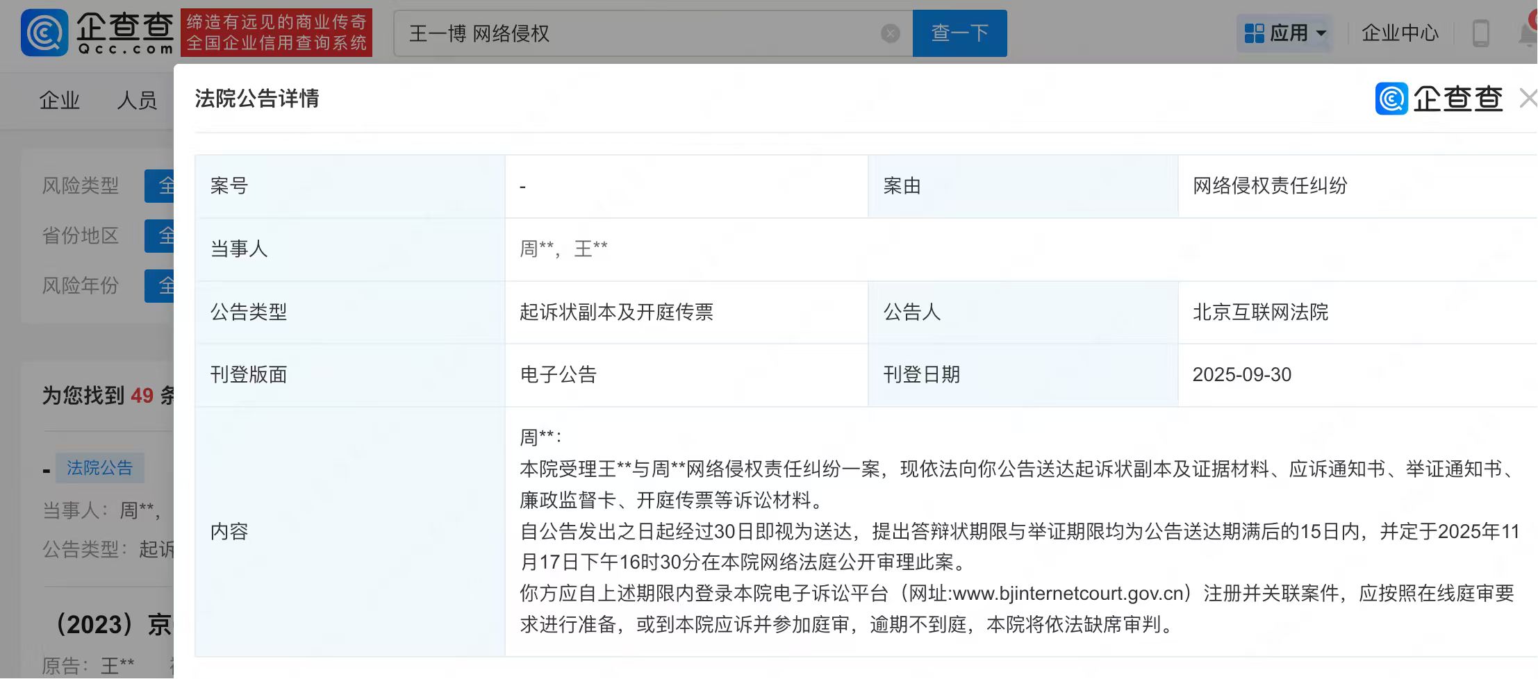 企查查APP显示,9月30日,法院向周某某送达王一博与其网络侵权责任纠纷起诉状副本及开庭传票等,定于2025年11月17日在北京互联网法院开庭审理。