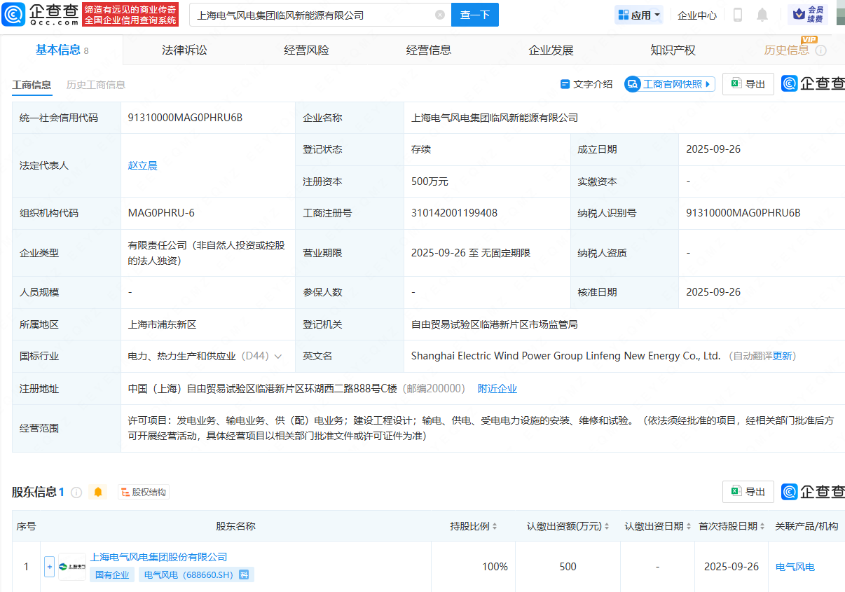 企查查APP显示,近日,上海电气风电集团临风新能源有限公司成立,法定代表人为赵立晨,经营范围包含:发电业务、输电业务、供(配)电业务;建设工程设计;输电、供电、受电电力设施的安装、维修和试验。企查查股权穿透显示,该公司由电气风电(688660)全资持股。