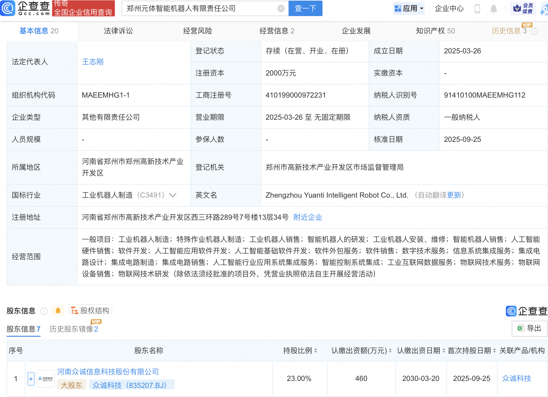 企查查APP显示,近日,郑州元体智能机器人有限责任公司发生工商变更,新增众诚科技(835207)为大股东,持股23%。企查查信息显示,该公司成立于2025年3月,注册资本2000万元,经营范围包含:智能机器人的研发;智能机器人销售;人工智能硬件销售;人工智能基础软件开发;集成电路设计等。