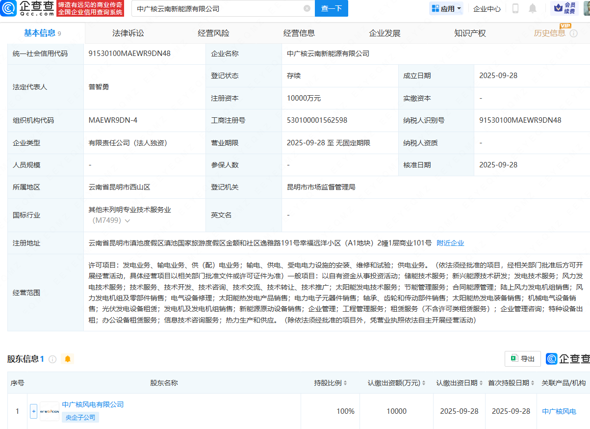 企查查APP显示,近日,中广核云南新能源有限公司成立,法定代表人为普智勇,注册资本为1亿元,经营范围包含:发电业务、输电业务、供(配)电业务;风力发电技术服务;太阳能发电技术服务;节能管理服务等。企查查股权穿透显示,该公司由中广核风电有限公司全资持股。