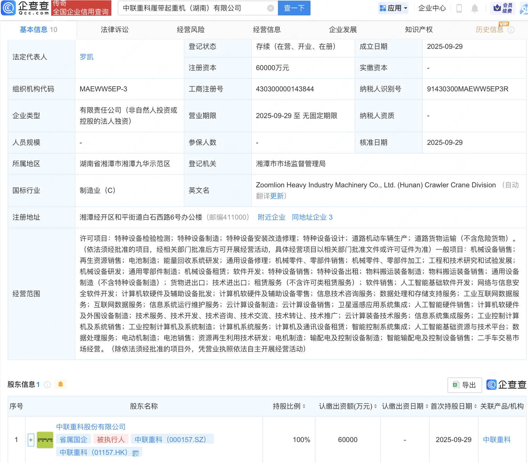 企查查APP显示,近日,中联重科履带起重机(湖南)有限公司成立,注册资本6亿元,经营范围包含:人工智能基础软件开发;卫星遥感应用系统集成;人工智能硬件销售;人工智能基础资源与技术平台等。企查查股权穿透显示,该公司由中联重科(000157)全资持股。