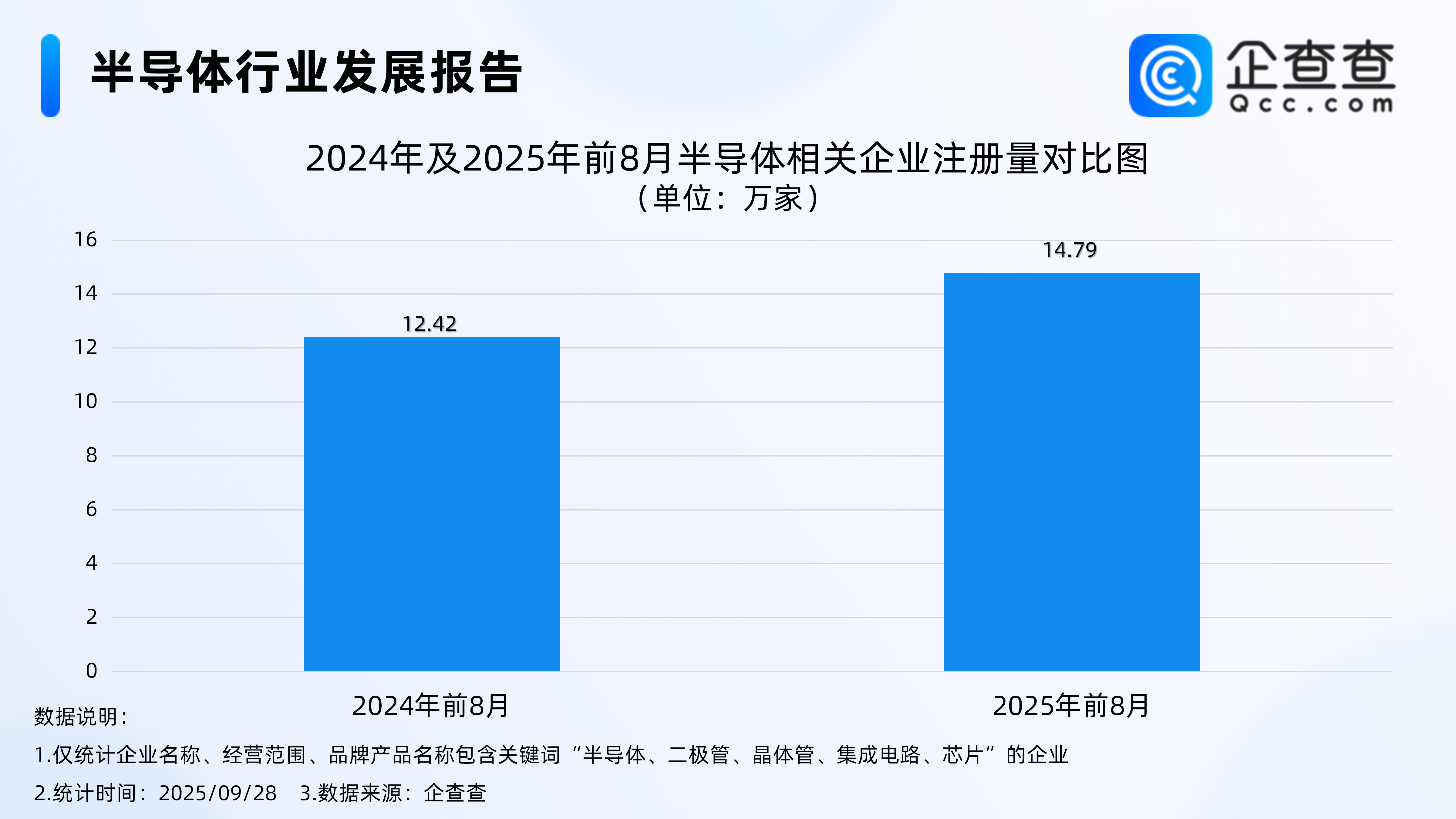 企查查数据显示,国内现存半导体相关企业107.6万家。近十年相关企业注册量呈整体增长态势,2023年全年注册量首次突破20万家,同比增长19.85%至20.66万家,达近十年注册量峰值。2024年全年注册19.51万家相关企业,虽较前一年有所下滑,但仍处于高位。截至目前,今年已注册16.55万家相关企业,其中前8月注册14.79万家,同比增长19.05%。