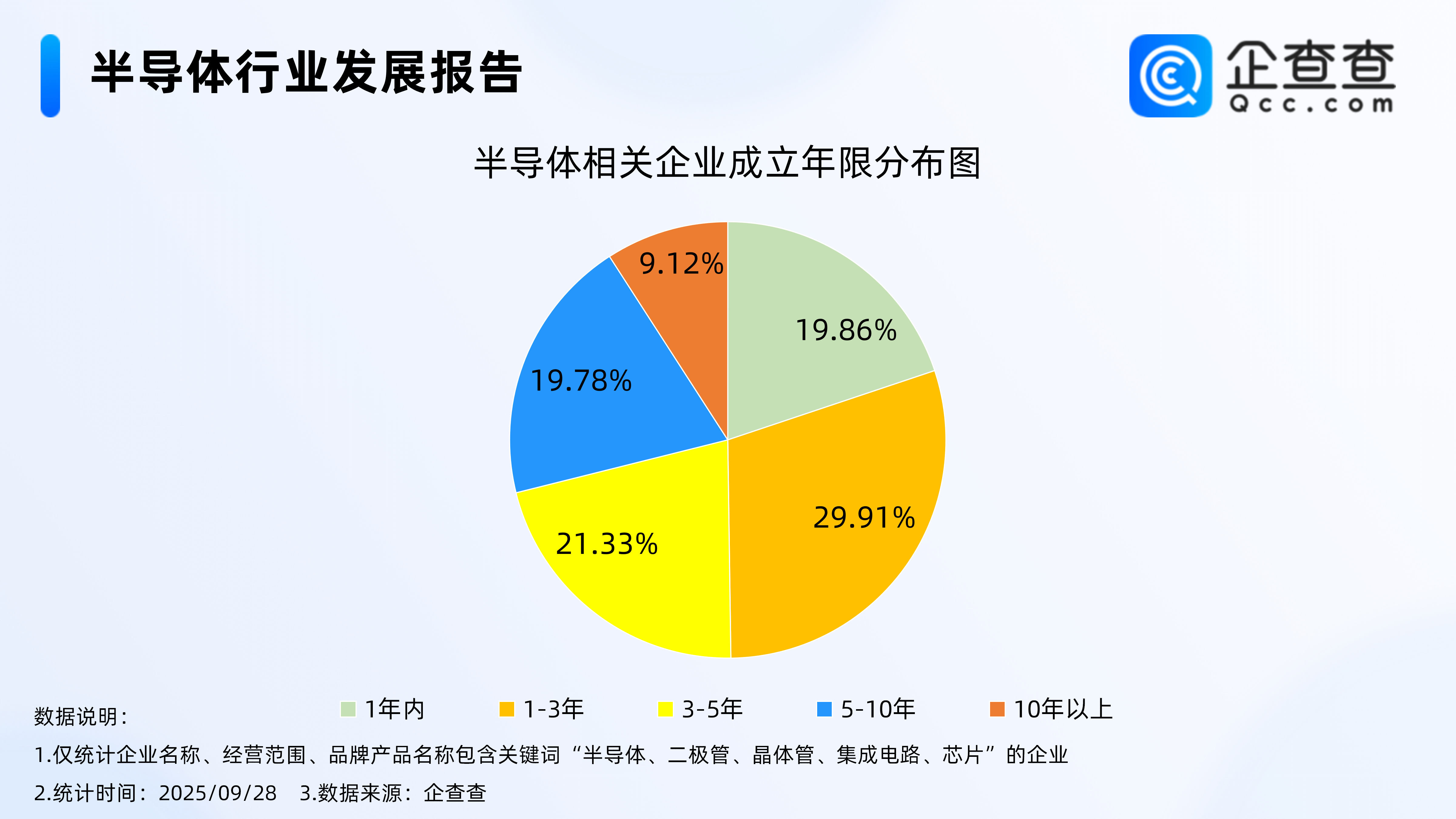 企查查数据显示,从经营时间来看,半导体相关企业多成立于近五年,成立年限在1-3年的相关企业最多,占比29.91%。其次,成立年限在3-5年、1年内的相关企业分别占比21.33%、19.86%。