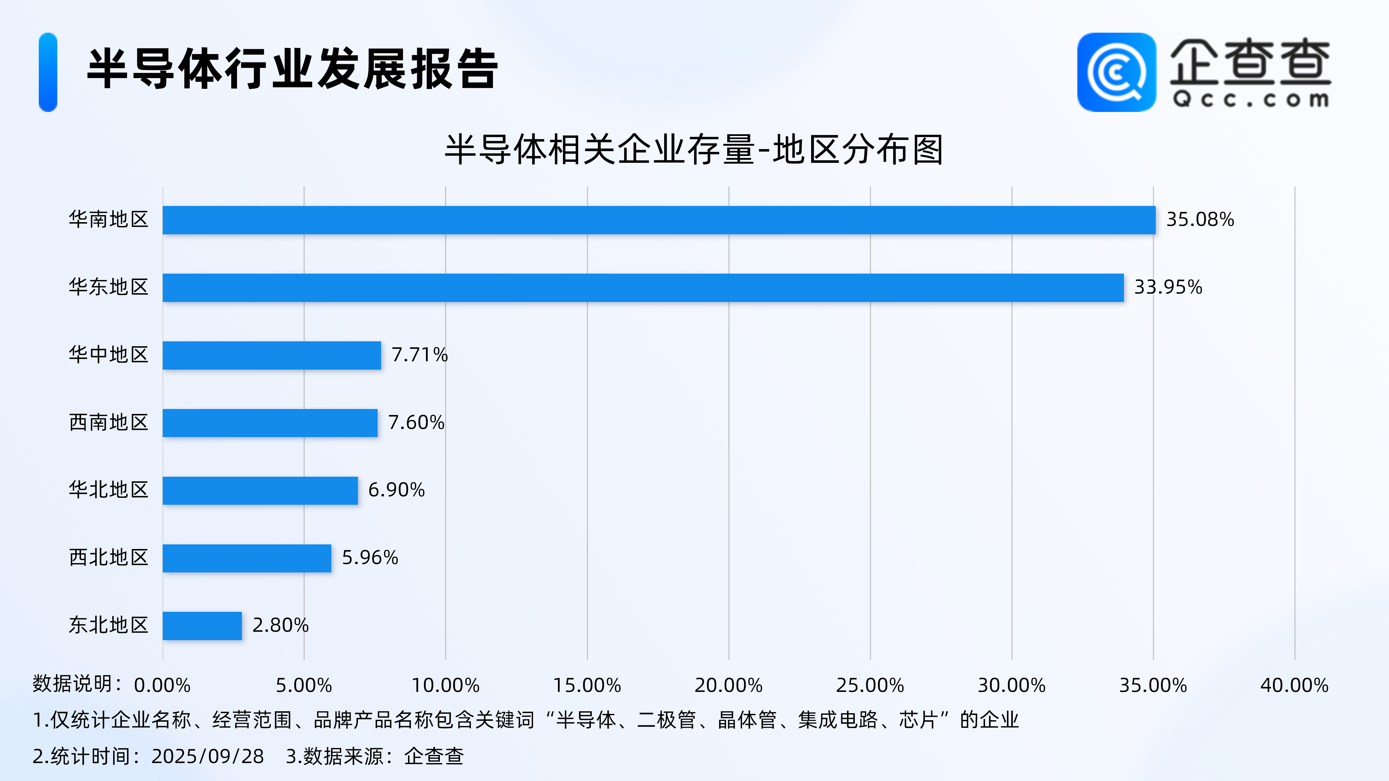 企查查数据显示,从地区分布来看,半导体相关企业主要集中分布在华南地区、华东地区,占比分别为35.08%、33.95%。分布在华中地区、西南地区等地的相关企业占比均不足8%。