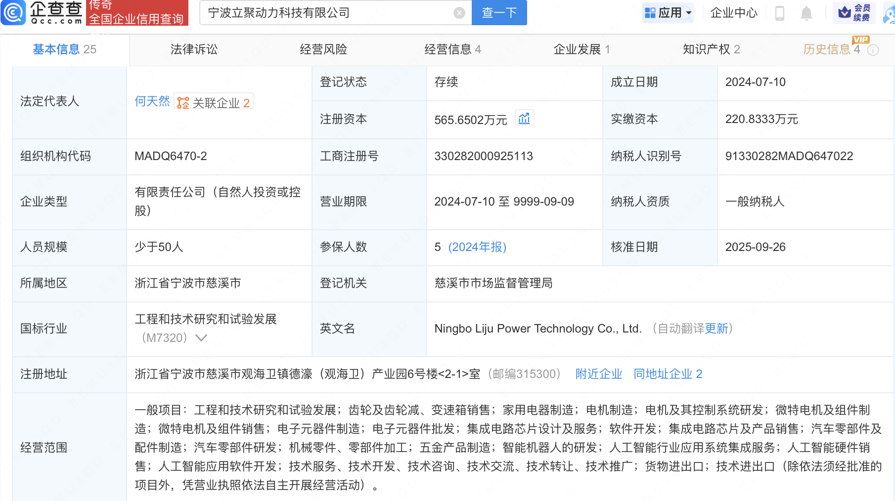 企查查APP显示,近日,宁波立聚动力科技有限公司发生工商变更,新增乐聚机器人关联公司乐聚智能(深圳)股份有限公司、中大力德(002896)为股东,同时注册资本增至565.65万元。企查查信息显示,该公司成立于2024年,法定代表人为何天然,经营范围包含:集成电路芯片设计及服务;汽车零部件研发;智能机器人的研发;人工智能行业应用系统集成服务;人工智能硬件销售等。