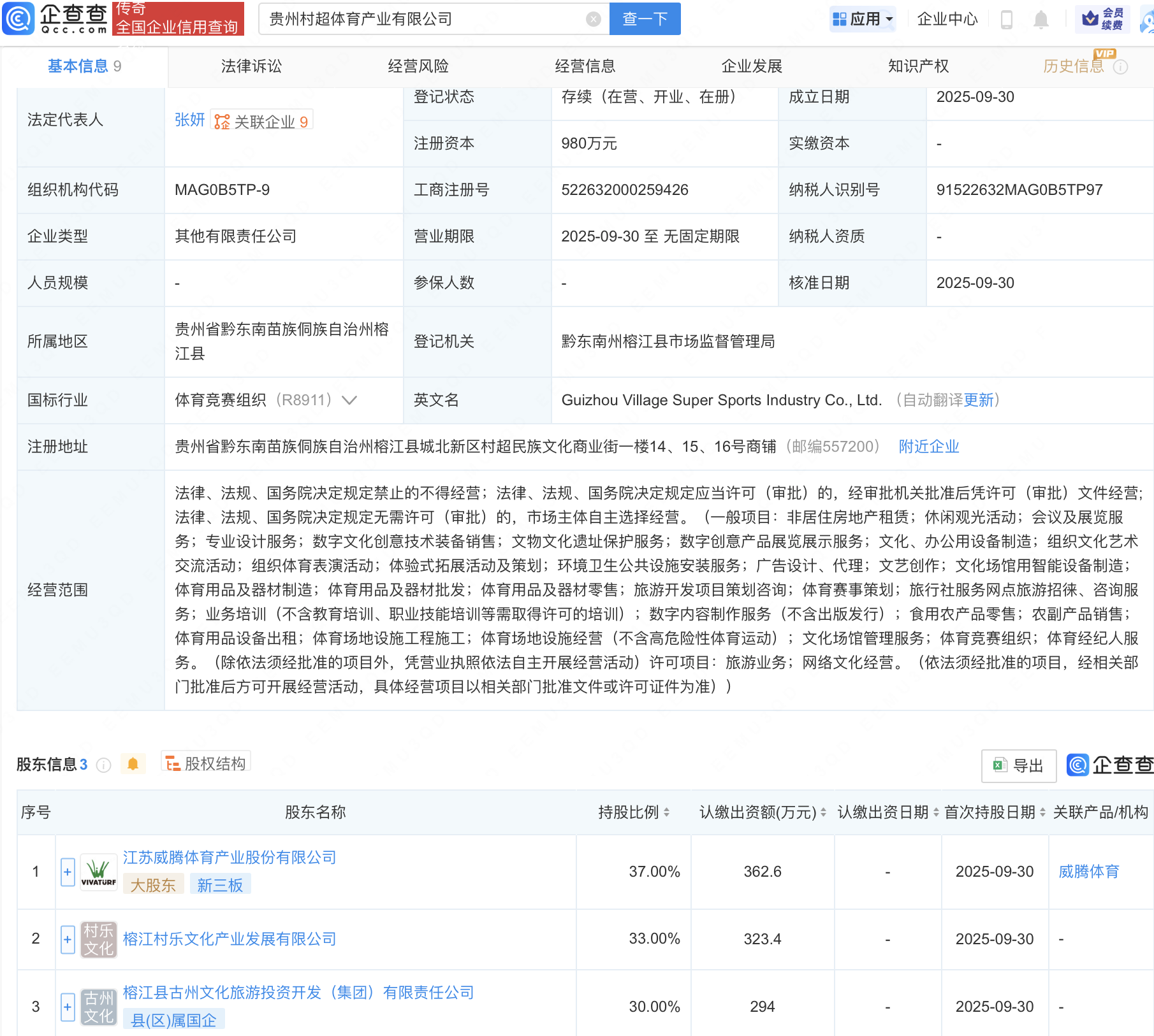 企查查APP显示,近日,贵州村超体育产业有限公司成立,法定代表人为张妍,经营范围包含:数字文化创意技术装备销售;文物文化遗址保护服务;数字创意产品展览展示服务等。企查查股权穿透显示,该公司由江苏威腾体育产业股份有限公司、榕江村乐文化产业发展有限公司等共同持股。