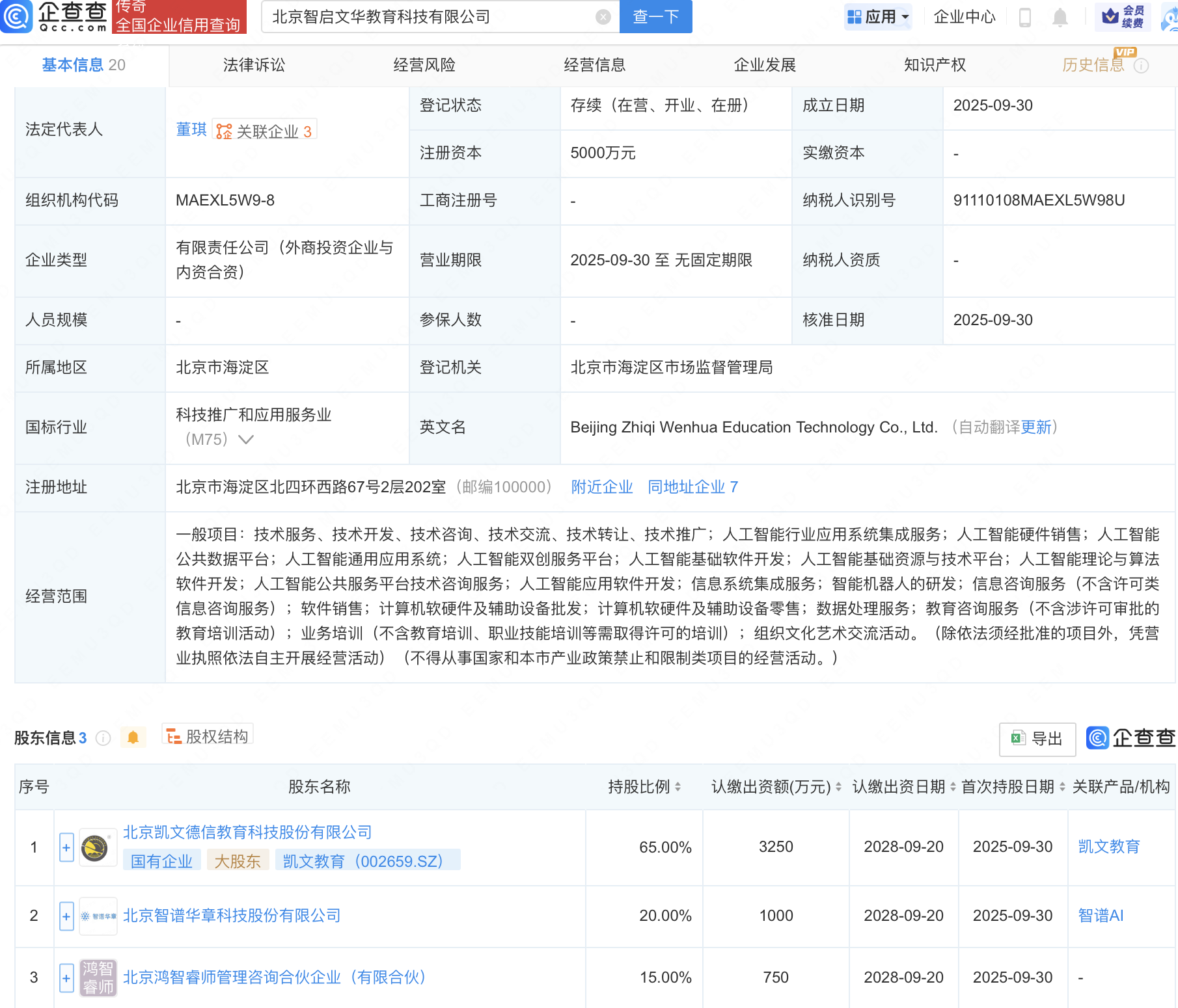 企查查APP显示,近日,北京智启文华教育科技有限公司成立,注册资本5000万元,经营范围包含:人工智能理论与算法软件开发;人工智能公共服务平台技术咨询服务;人工智能应用软件开发;智能机器人的研发等。企查查股权穿透显示,该公司由凯文教育(002659)、智谱AI关联公司北京智谱华章科技股份有限公司等共同持股。