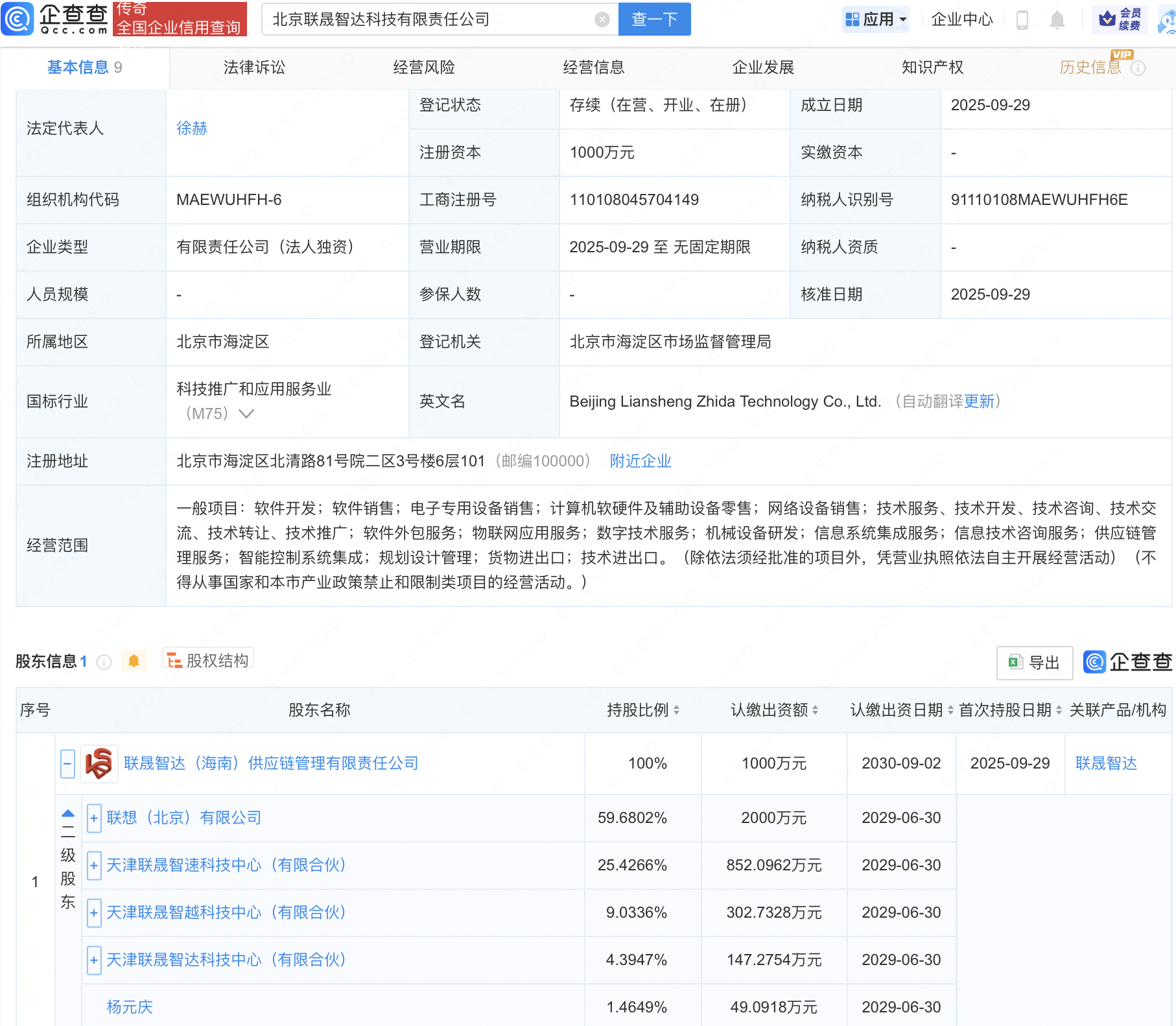 企查查APP显示,近日,北京联晟智达科技有限责任公司成立,注册资本1000万元,经营范围包含:物联网应用服务;数字技术服务;供应链管理服务;智能控制系统集成等。企查查股权穿透显示,该公司由联想(北京)有限公司旗下联晟智达(海南)供应链管理有限责任公司全资持股。