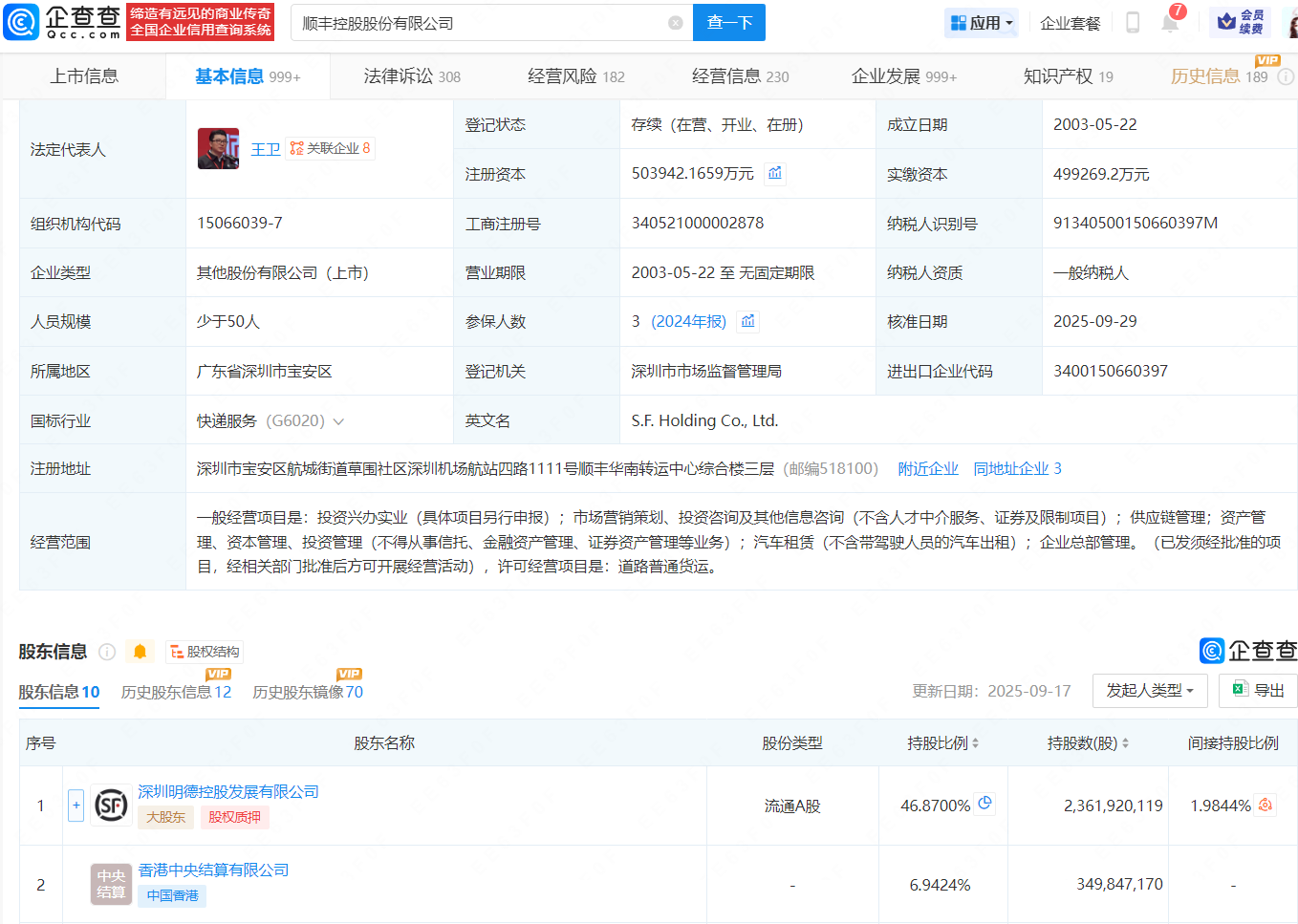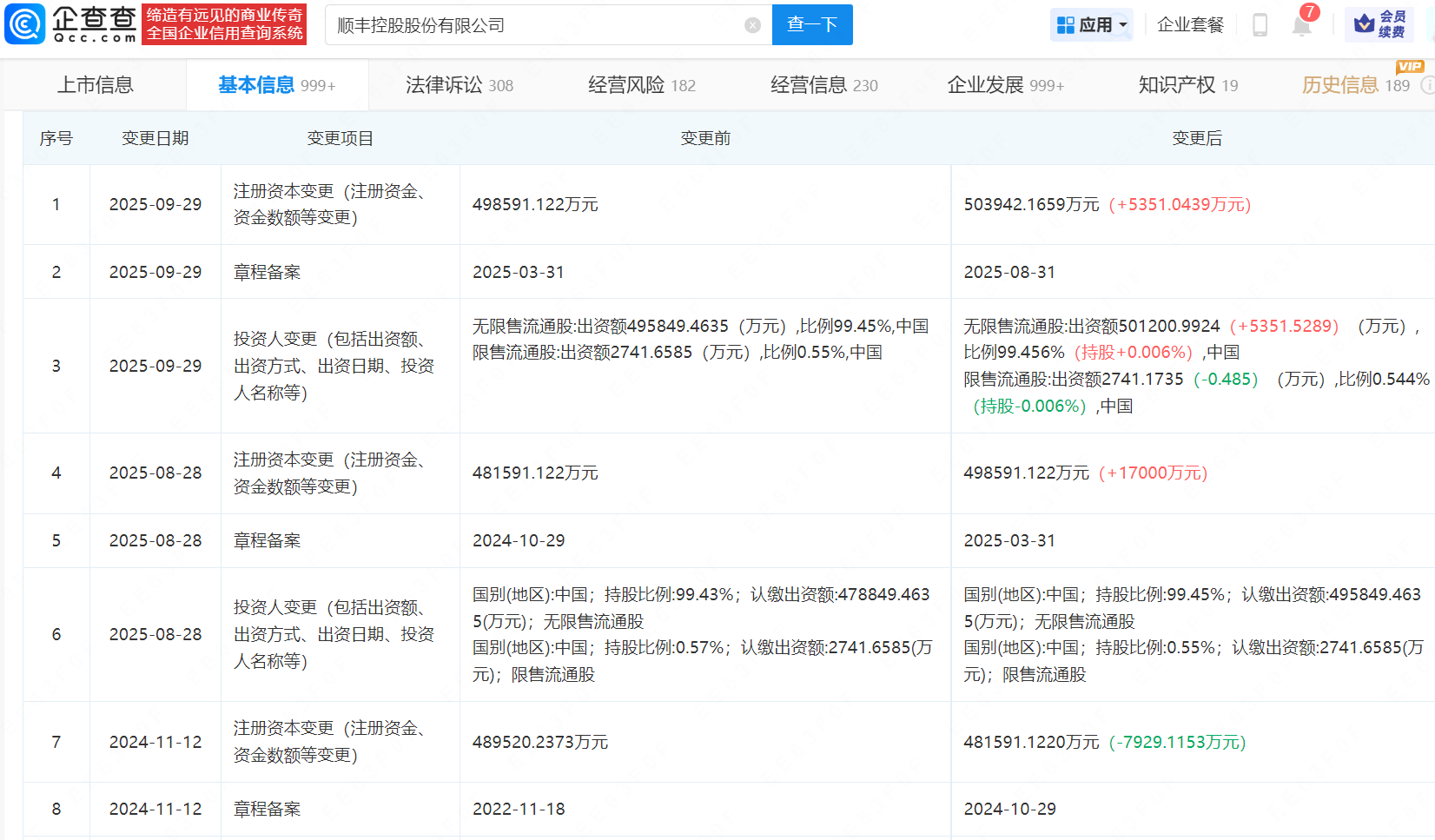 企查查APP显示,近日,顺丰控股(002352)发生工商变更,注册资本由约49.9亿元增至约50.4亿元。今年8月,该公司注册资本由约48.2亿人民币增至约49.9亿人民币。企查查信息显示,该公司成立于2003年5月,法定代表人为王卫,经营范围包含投资兴办实业,市场营销策划、投资咨询及其他信息咨询等,由深圳明德控股发展有限公司、香港中央结算有限公司等共同持股。