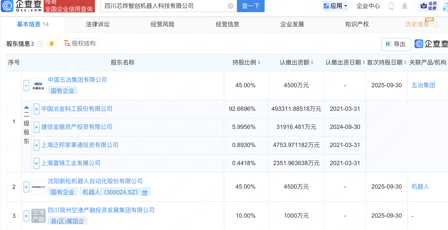 企查查APP显示,近日,四川芯烨智创机器人科技有限公司成立,注册资本1亿元,经营范围包含:智能机器人的研发;人工智能基础软件开发;人工智能应用软件开发;人工智能理论与算法软件开发等。企查查股权穿透显示,该公司由中国中冶(601618)旗下中国五冶集团有限公司、机器人(300024)等共同持股。