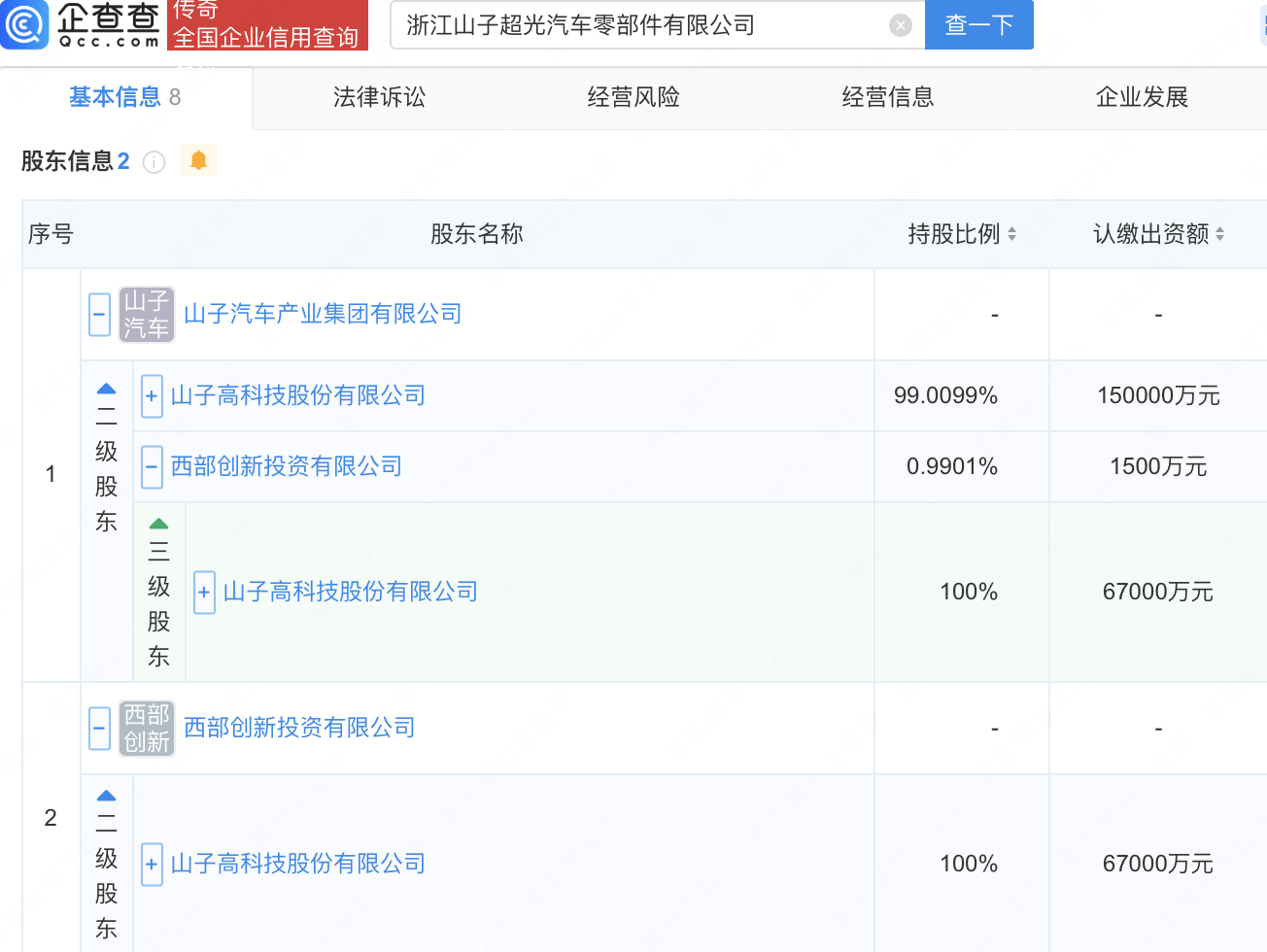 企查查APP显示,近日,浙江山子超光汽车零部件有限公司成立,注册资本1000万元,经营范围包含:汽车零部件研发;汽车零配件批发;新能源汽车电附件销售;电池销售等。企查查股权穿透显示,该公司由山子高科(000981)间接全资持股。