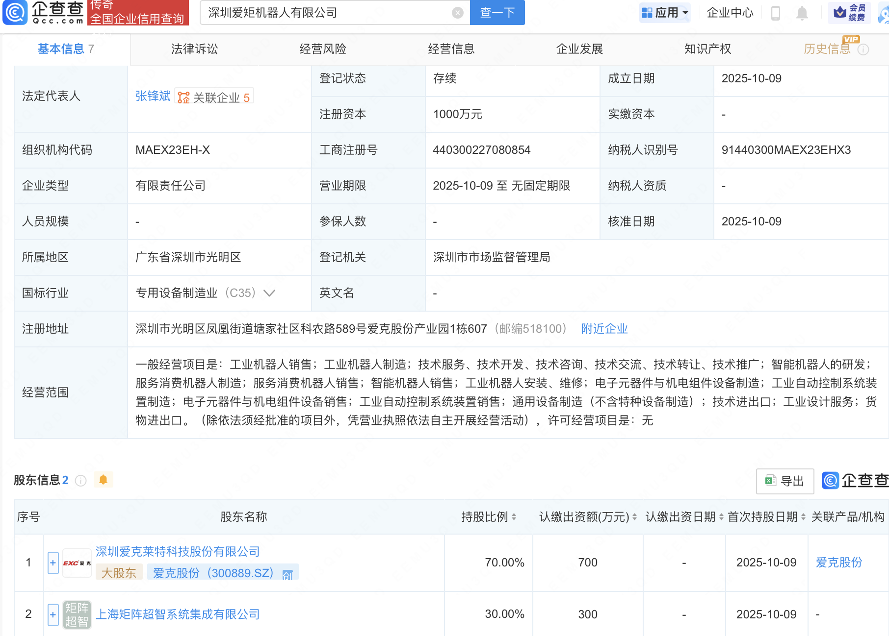 企查查APP显示,近日,深圳爱矩机器人有限公司成立,注册资本1000万元,经营范围包含:智能机器人的研发;服务消费机器人制造;服务消费机器人销售;智能机器人销售等。企查查股权穿透显示,该公司由爱克股份(300889)等共同持股。