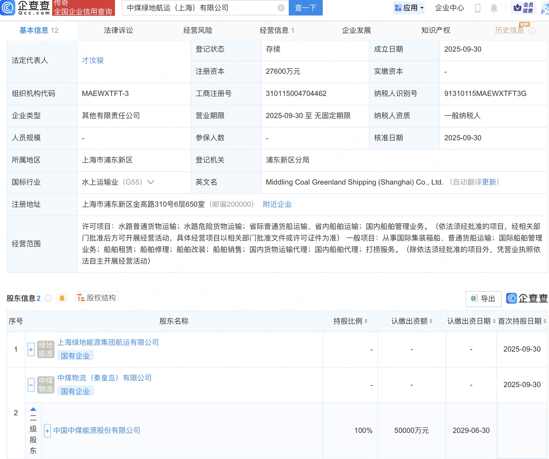 企查查APP显示,近日,中煤绿地航运(上海)有限公司成立,法定代表人为才汝骏,注册资本2.76亿人民币,经营范围包括水路普通货物运输、水路危险货物运输、国内船舶管理业务等。企查查股权穿透显示,该公司由中煤能源(601898)全资子公司中煤物流(秦皇岛)有限公司、上海绿地能源集团航运有限公司共同持股。