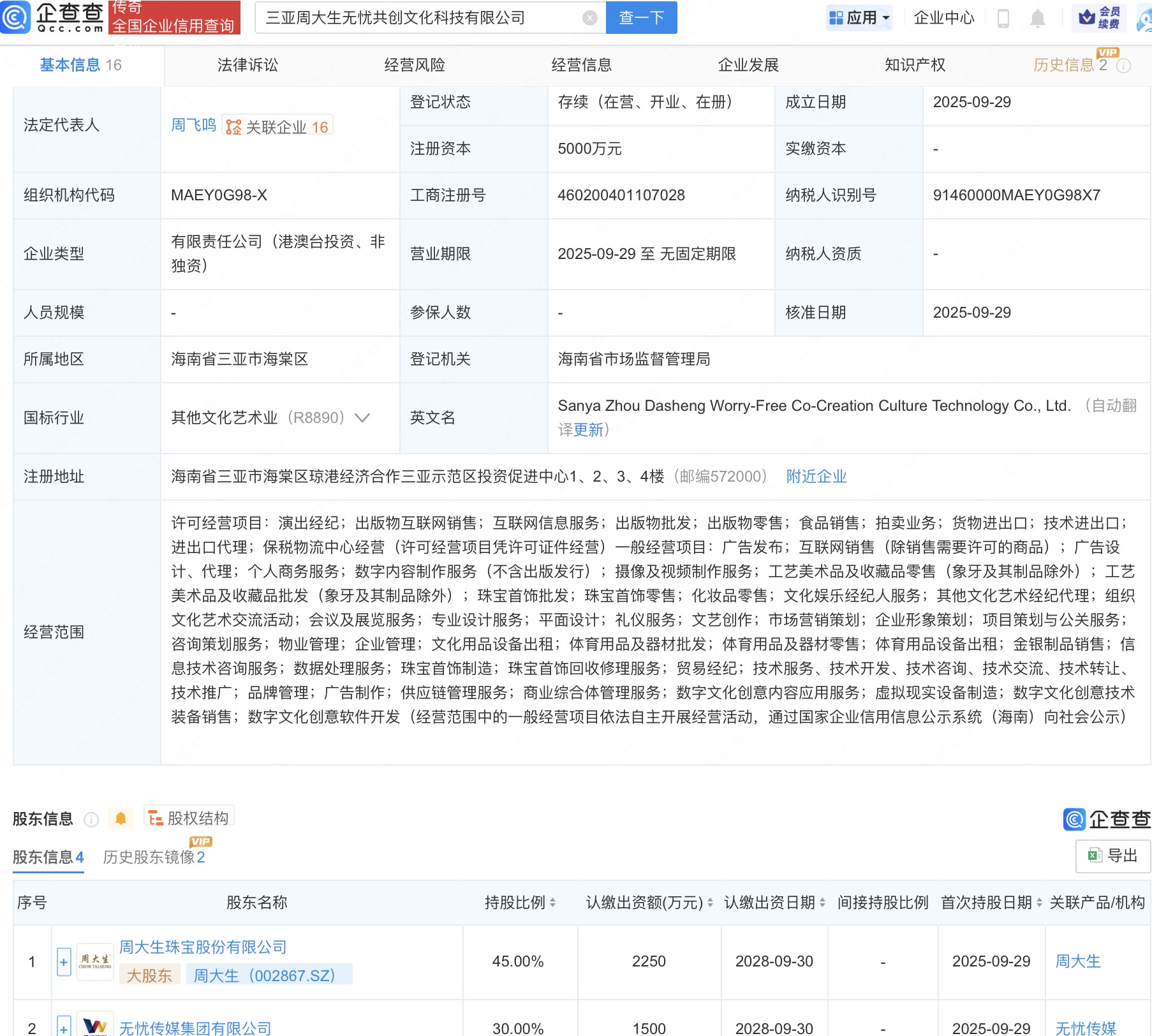 企查查APP显示,近日,三亚周大生无忧共创文化科技有限公司成立,法定代表人为周飞鸣,注册资本5000万人民币,经营范围包括演出经纪、出版物互联网销售、互联网信息服务等。企查查股权穿透显示,该公司由周大生(002867)、无忧传媒集团有限公司等共同持股。