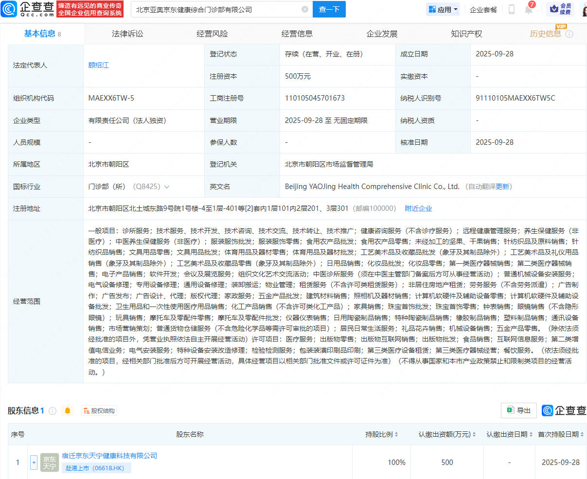 企查查APP显示,近日,北京亚奥京东健康综合门诊部有限公司成立,法定代表人为顾绍江,注册资本500万元,经营范围包含诊所服务、远程健康管理服务、服装服饰零售等,由宿迁京东天宁健康科技有限公司全资持股。