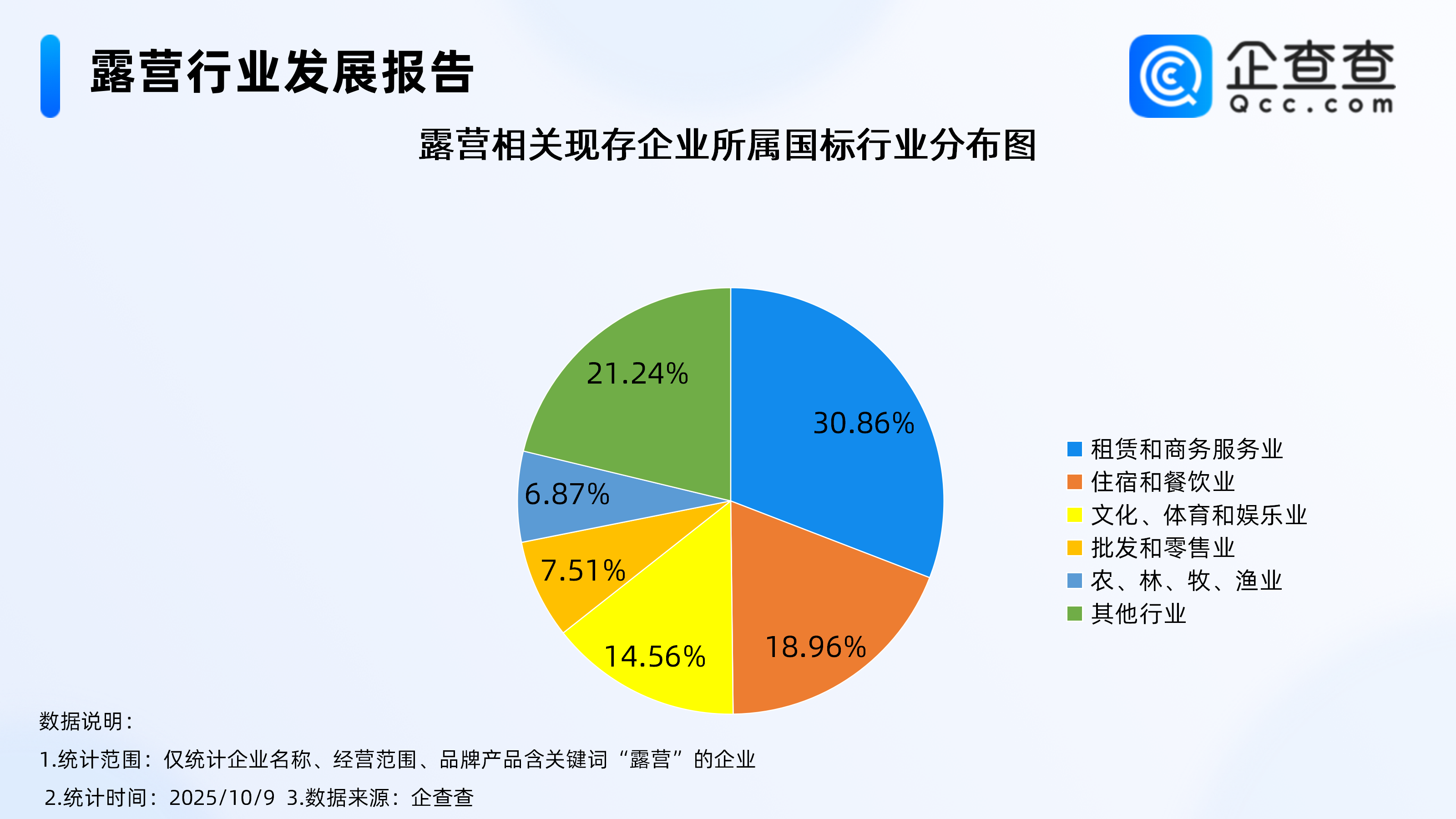 企查查数据显示,国标行业分布上,国内露营相关现存企业中,超3成相关企业归属于租赁和商务服务业,占比达30.86%,其次为住宿和餐饮业,文化、体育和娱乐业,分别占比18.96%、14.56%。