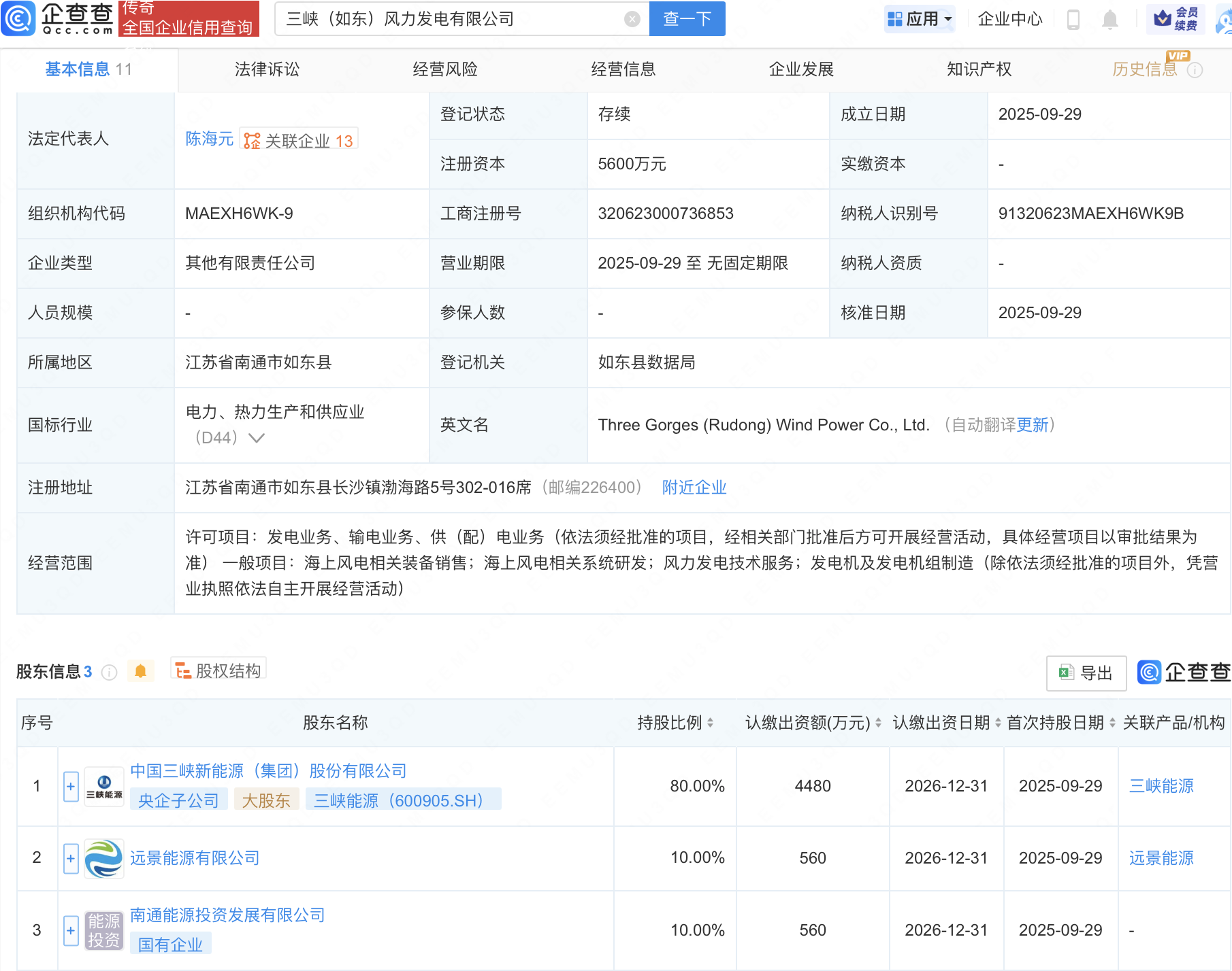 企查查APP显示,近日,三峡(如东)风力发电有限公司成立,注册资本5600万元,经营范围包含:海上风电相关装备销售;海上风电相关系统研发;风力发电技术服务;发电机及发电机组制造等。企查查股权穿透显示,该公司由三峡能源(600905)、远景能源有限公司等共同持股。