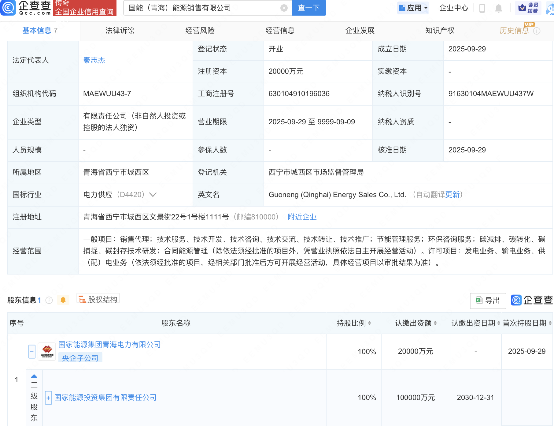 企查查APP显示,近日,国能(青海)能源销售有限公司成立,注册资本2亿元,经营范围包含:节能管理服务;环保咨询服务;碳减排、碳转化、碳捕捉、碳封存技术研发等。企查查股权穿透显示,该公司由国家能源投资集团有限责任公司间接全资持股。