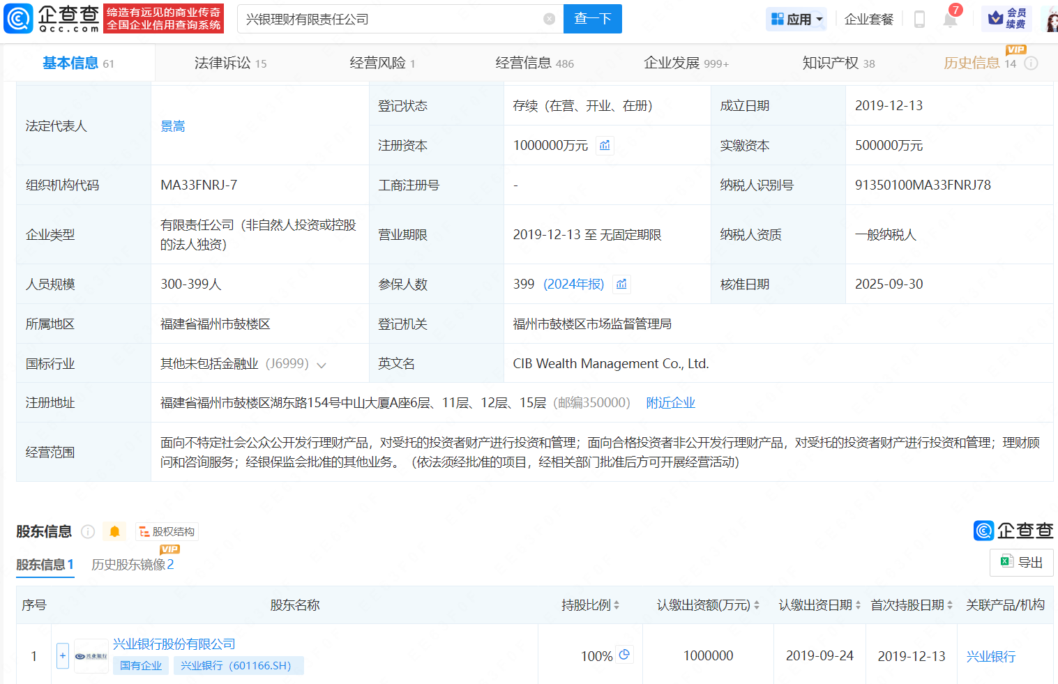 企查查APP显示,近日,兴银理财有限责任公司发生工商变更,注册资本由50亿增至100亿元,增幅100%。企查查信息显示,该公司成立于2019年12月,法定代表人为景嵩,经营范围包含面向不特定社会公众公开发行理财产品,对受托的投资者财产进行投资和管理等,由兴业银行(601166)全资持股。
