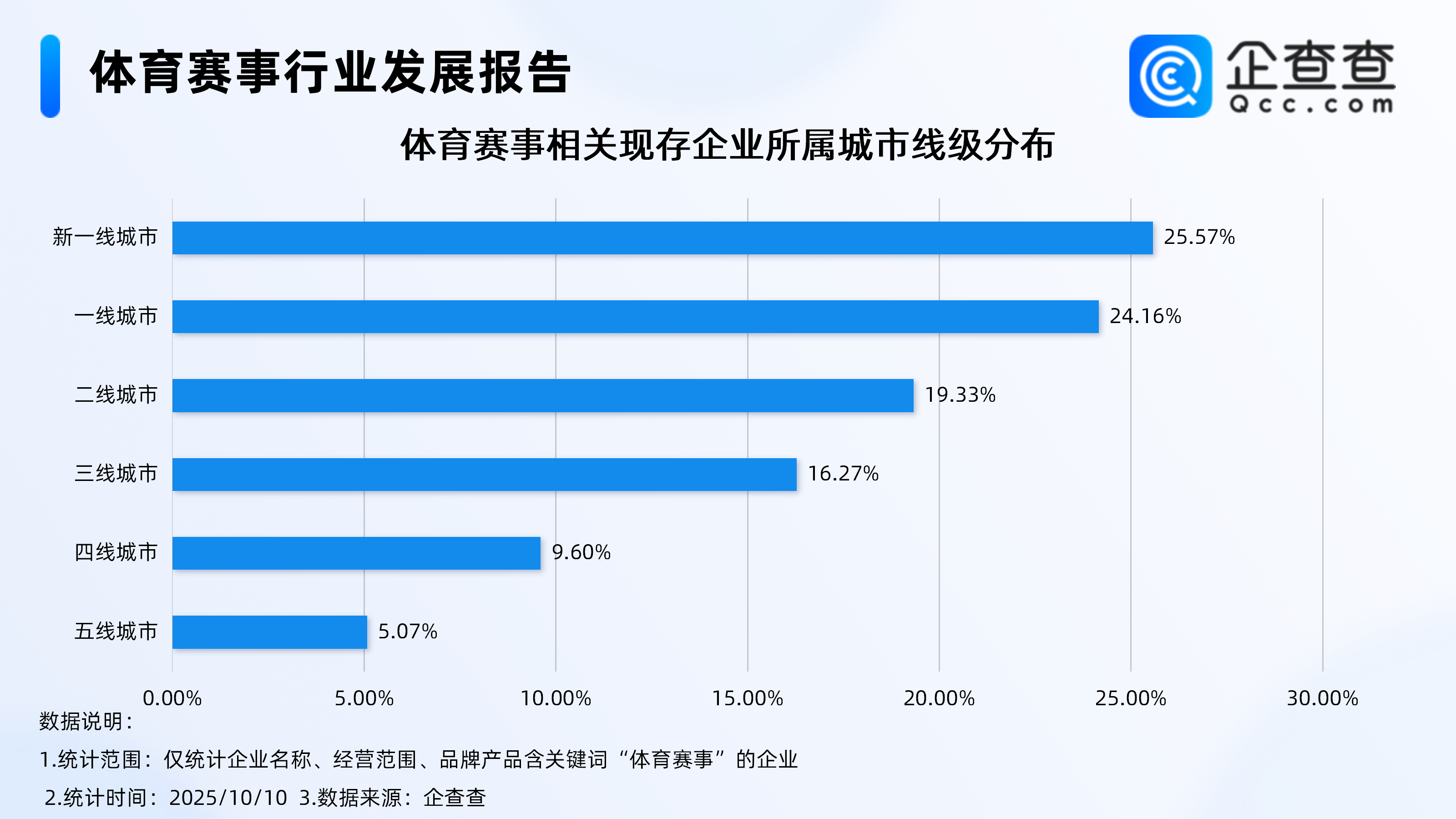 企查查数据显示,截至10月10日,国内体育赛事相关现存企业达79.33万家,主要分布在新一线、一线城市,分别占比25.57%、24.16%。其次为分布在二线、三线城市的相关企业,分别占比19.33%、16.27%。位于四线、五线城市的相关企业,占比均不到10%。
