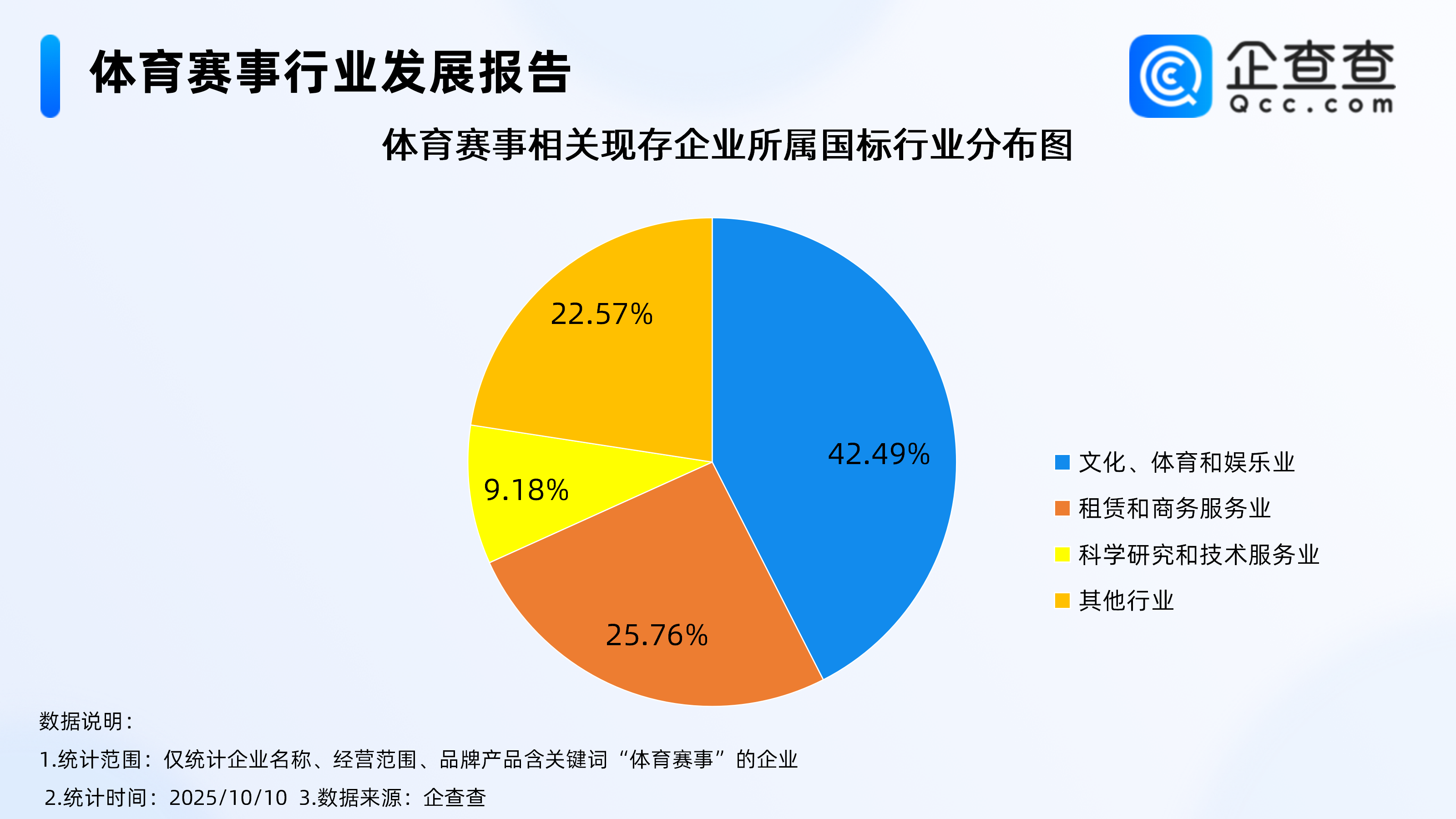 企查查数据显示,从国标行业分布来看,国内体育赛事相关现存企业中,超4成相关企业归属于文化、体育和娱乐业,占比达42.49%,其次为租赁和商务服务业,占比达25.76%。