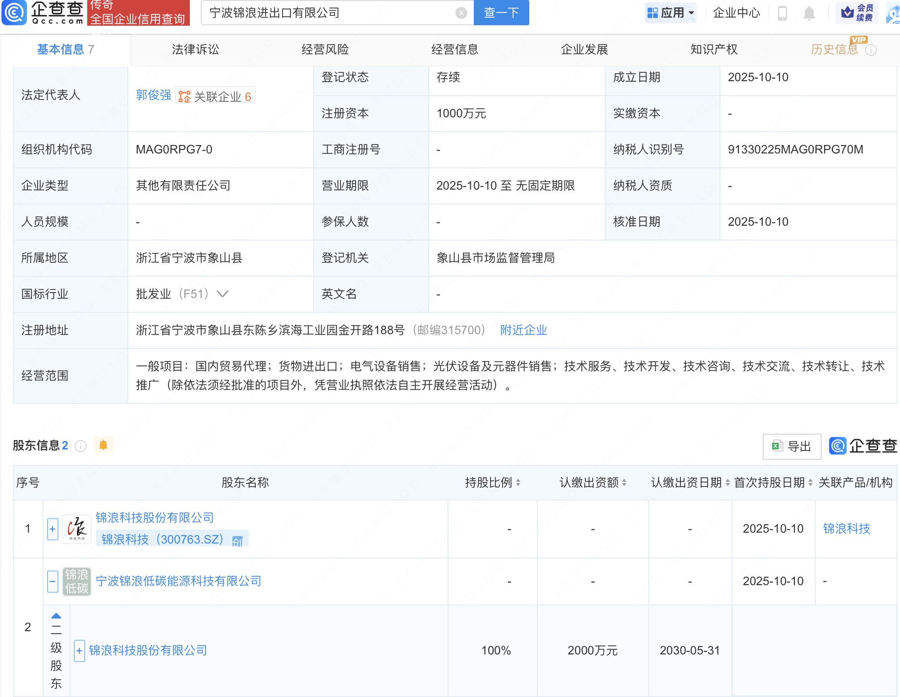 企查查APP显示,近日,宁波锦浪进出口有限公司成立,注册资本1000万元,经营范围包含:国内贸易代理;货物进出口;电气设备销售;光伏设备及元器件销售等。企查查股权穿透显示,该公司由锦浪科技(300763)间接全资持股。
