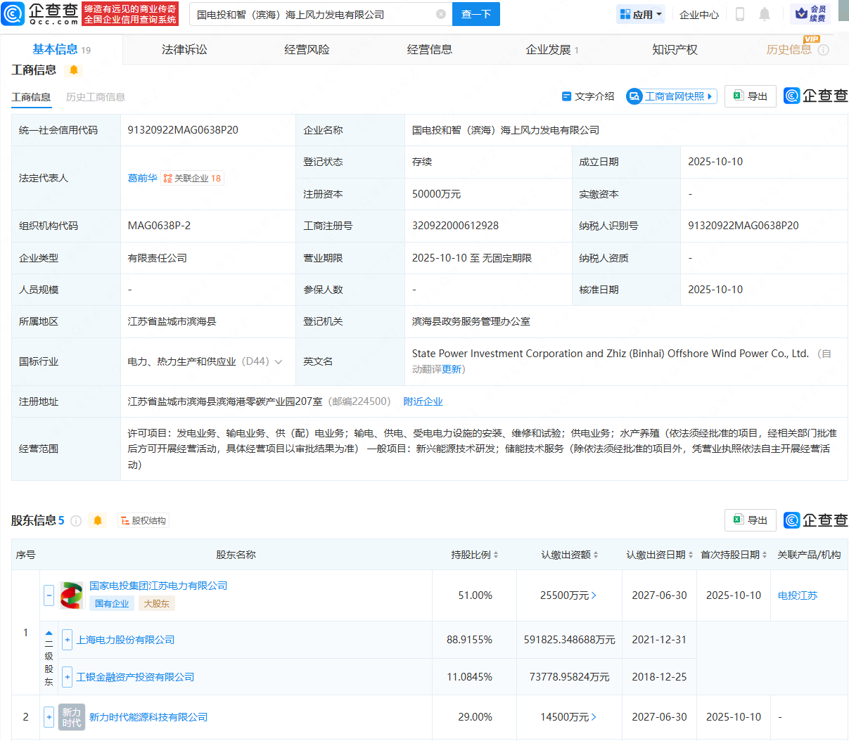 企查查APP显示,近日,国电投和智(滨海)海上风力发电有限公司成立,法定代表人为葛前华,注册资本为5亿元,经营范围包含:发电业务、输电业务、供(配)电业务;供电业务;水产养殖;新兴能源技术研发;储能技术服务等。企查查股权穿透显示,该公司由上海电力(600021)旗下国家电投集团江苏电力有限公司、新力时代能源科技有限公司等共同持股。