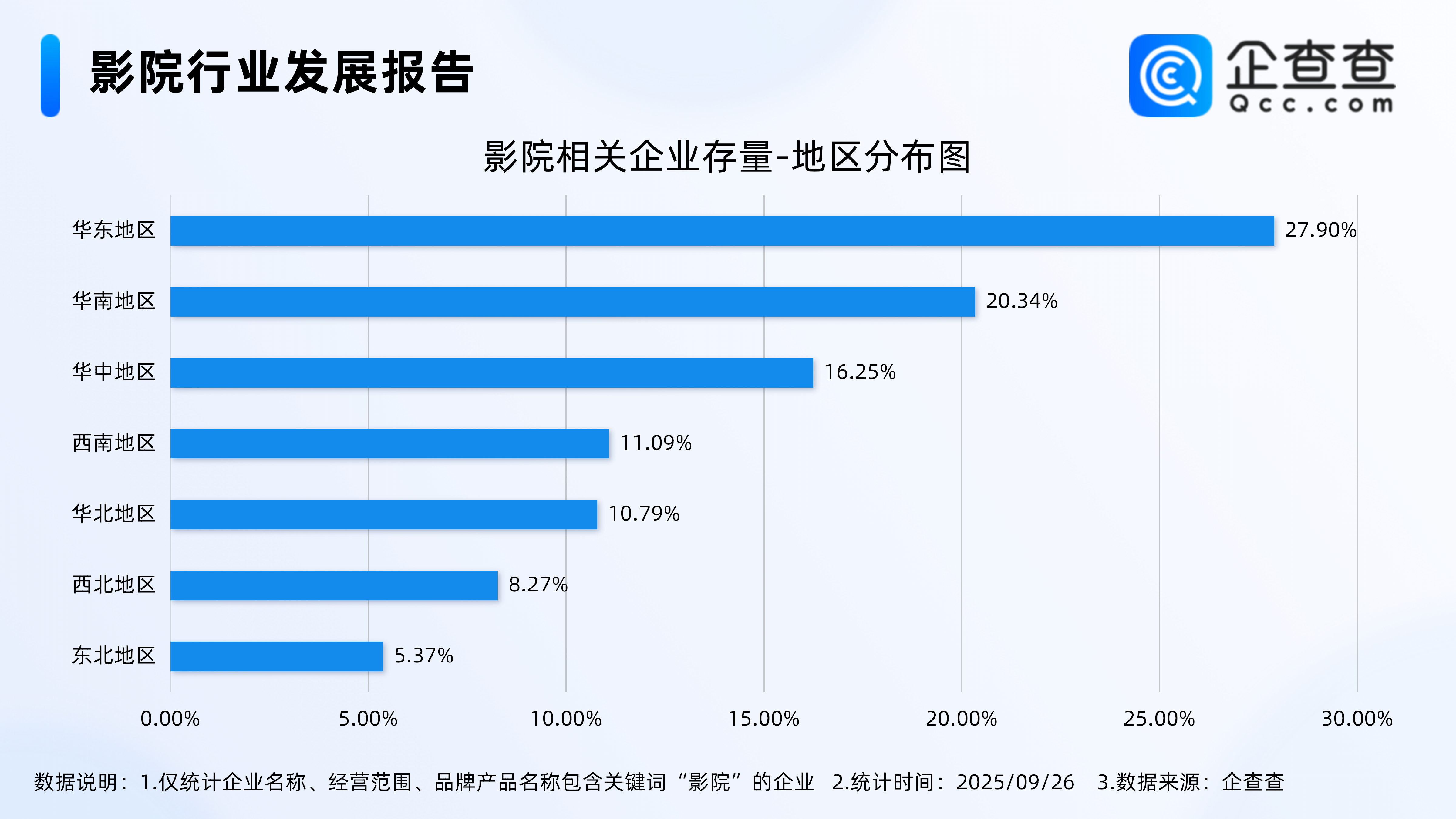 企查查数据显示,从地区分布来看,影院相关企业多分布在华东地区,占比27.90%。其次,分布在华南地区、华中地区的相关企业分别占比20.34%、16.25%。