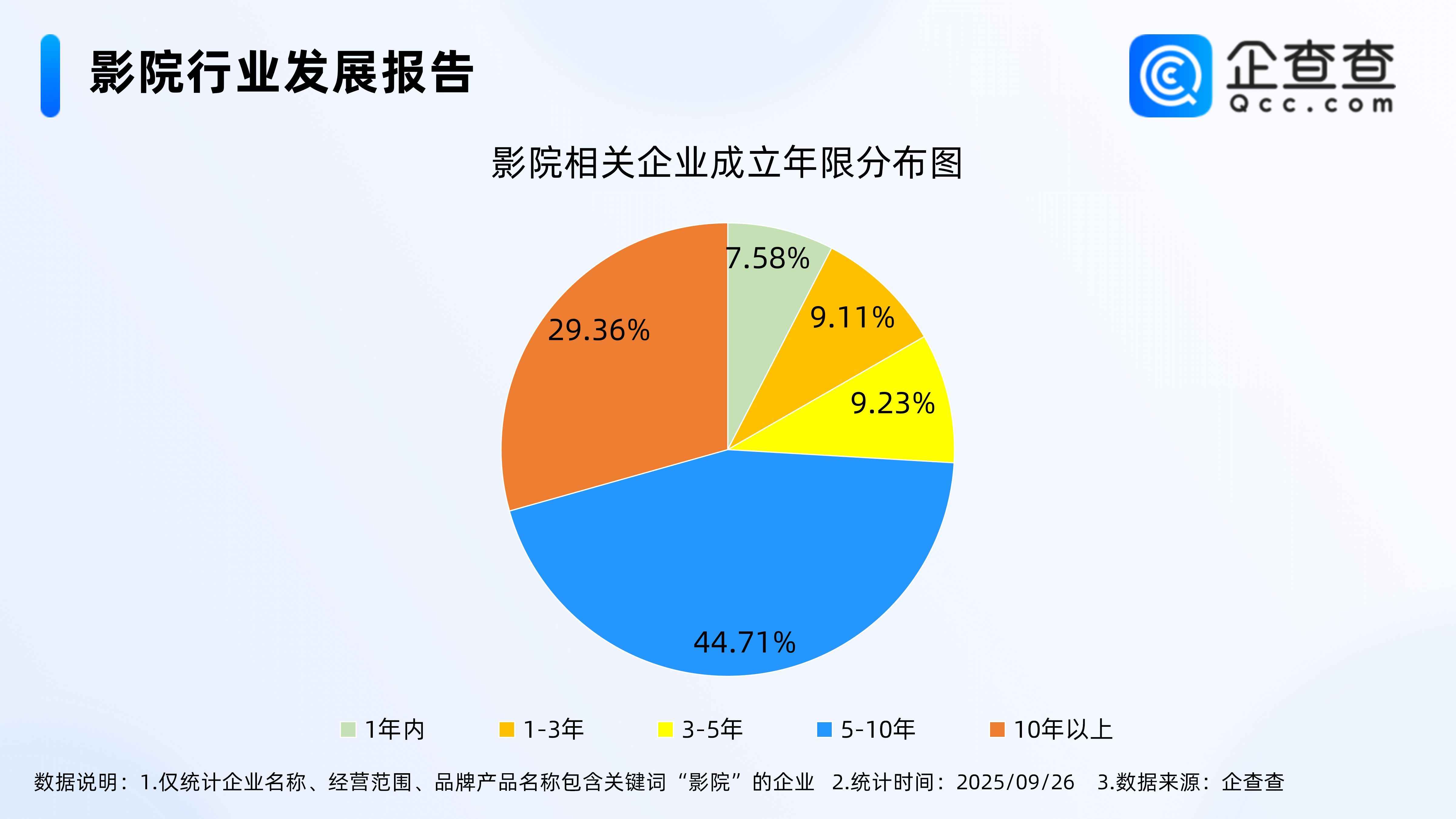 企查查数据显示,从经营时间来看,影院相关企业多为老牌企业,成立年限在5-10年的相关企业最多,占比达44.71%。其次,成立年限在10年以上的相关企业占比29.36%。