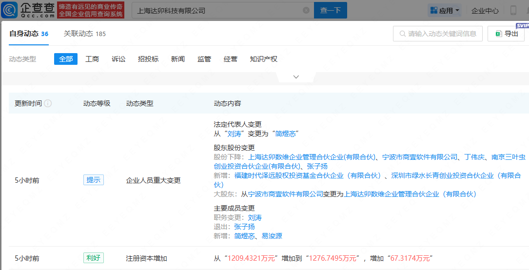 企查查APP显示,近日,上海达卯科技有限公司发生工商变更,新增宁德时代(300750)参投的福建时代泽远股权投资基金合伙企业(有限合伙)、深圳市绿水长青创业投资合伙企业(有限合伙)为股东;注册资本由约1209万人民币增至约1277万人民币;刘涛卸任法定代表人,由简煜忞接任,同时多位高管发生变更。