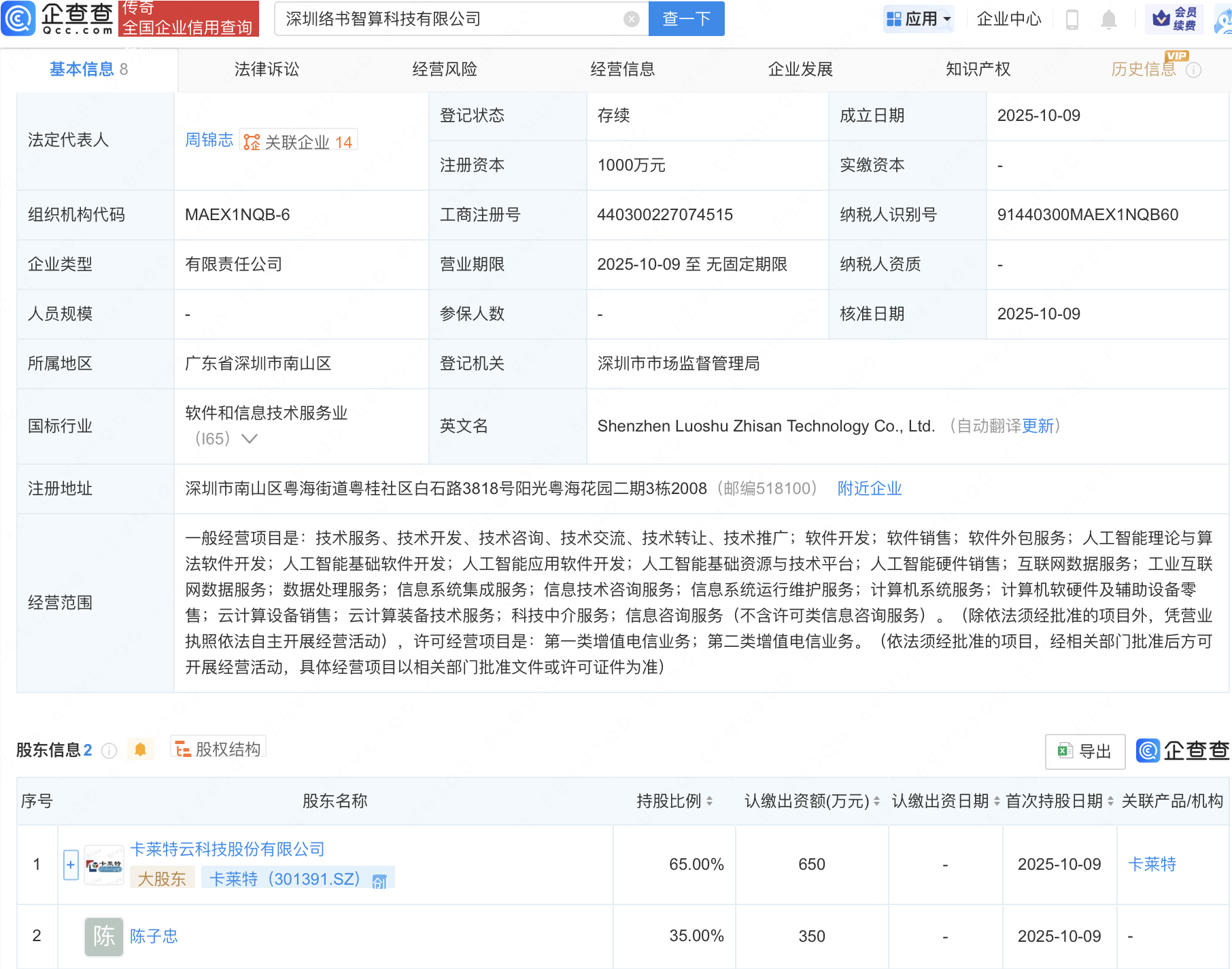 企查查APP显示,近日,深圳络书智算科技有限公司成立,注册资本1000万元,经营范围包含:人工智能理论与算法软件开发;人工智能基础软件开发;人工智能应用软件开发;人工智能基础资源与技术平台等。企查查股权穿透显示,该公司由卡莱特(301391)等共同持股。