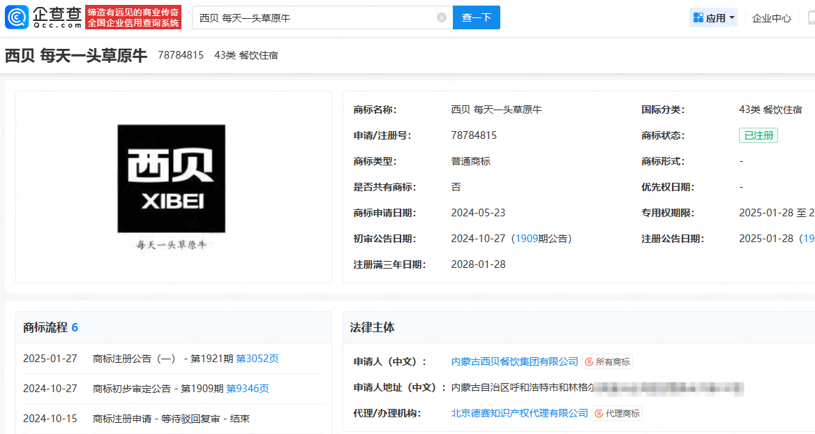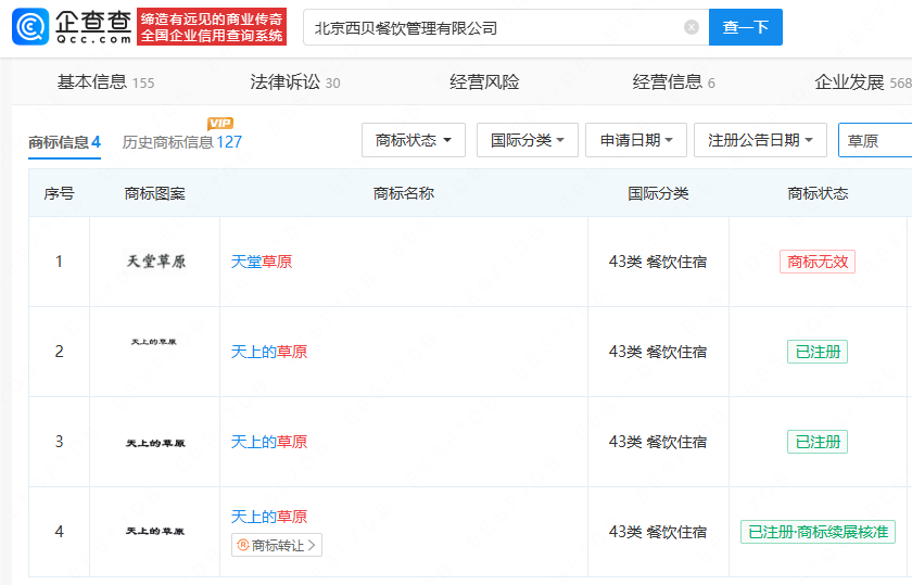 查询西贝官网发现,今年年初其曾进行Logo焕新升级,“西贝莜面村”升级为“西贝XIBEI”,图片仍为红白配色。企查查APP显示,北京西贝餐饮管理有限公司曾注册“天上的草原”商标,内蒙古西贝餐饮集团有限公司也曾注册“西贝 每天一头草原牛”商标。